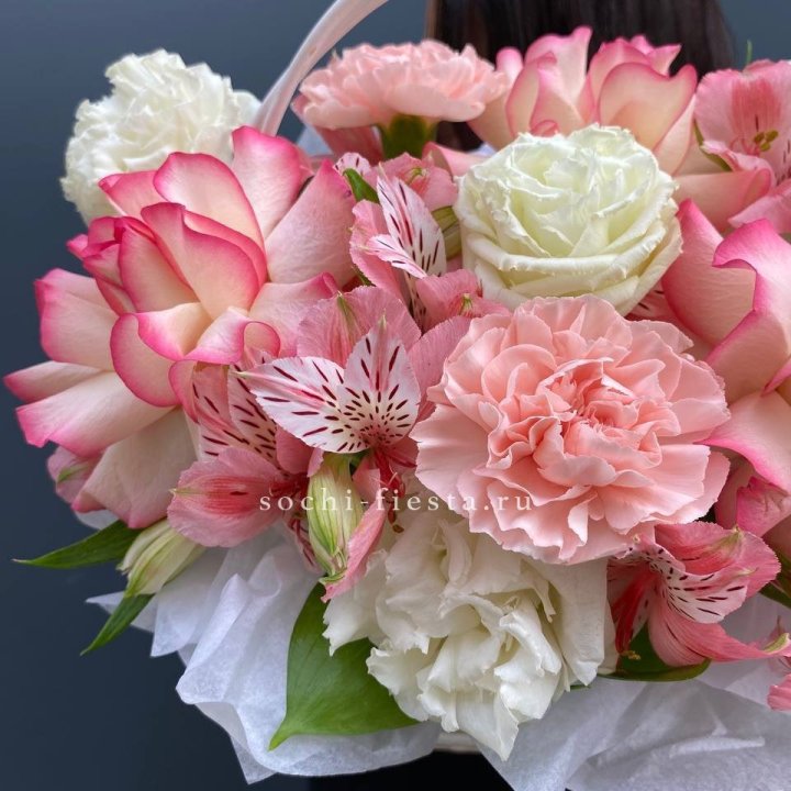 Ассортимент рабочий, под разные поводы. Розы Red Naomi и Freedom от 50 до 70 см стебель, кустовые хризантемы, альстромерия, гипсофила, эустома, эвкалипт. В сезон — пионы (конец мая — июнь), ранункулюсы зимой и ранней весной, тюльпаны весной. Авторские миксы с эвкалиптом и лавандой — для тех, кому нужна небанальная композиция.