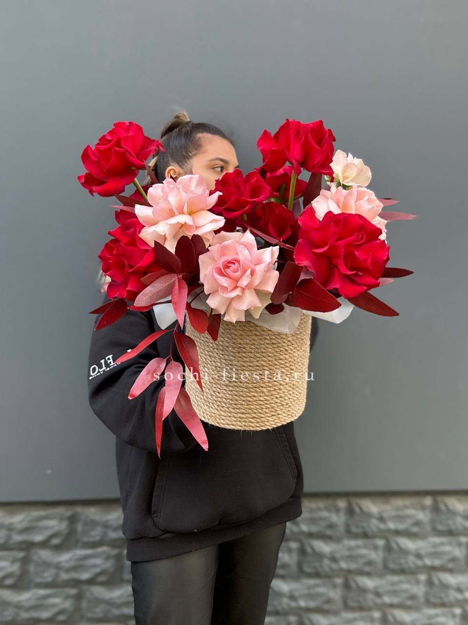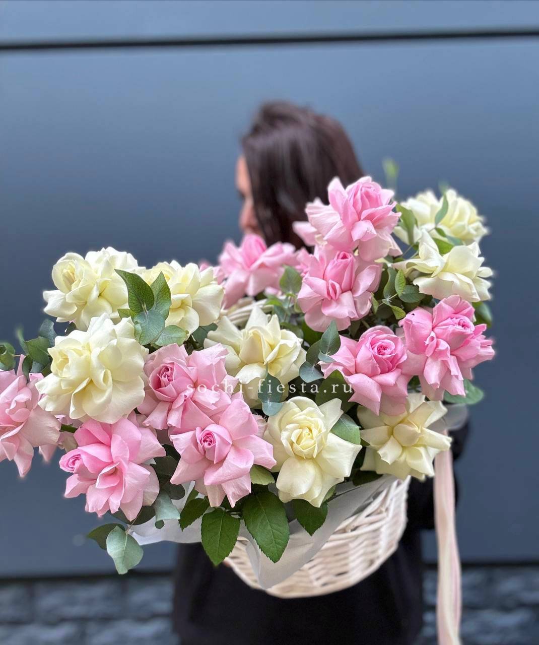 Масштабная композиция из ста одной кустовой пионовидной розы занимает всё внимание. Множество бутонов с волнистыми лепестками создают живую фактуру и впечатляющее присутствие в любом пространстве.