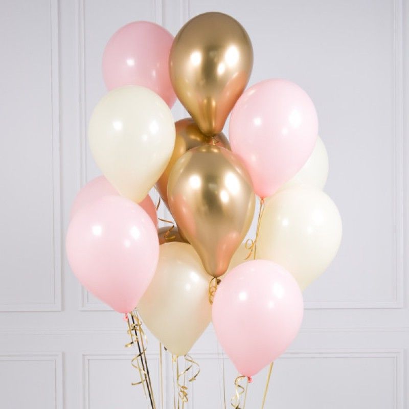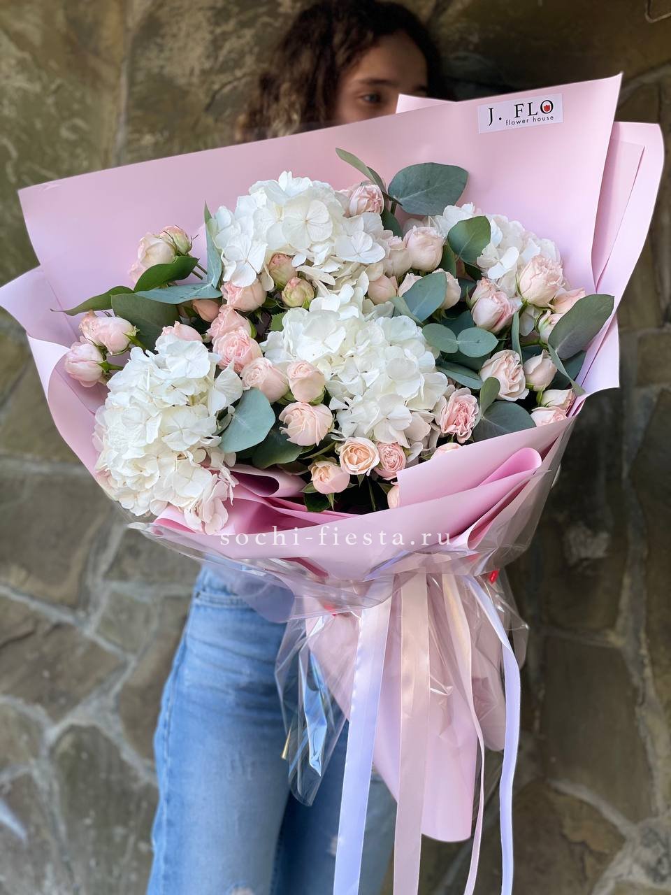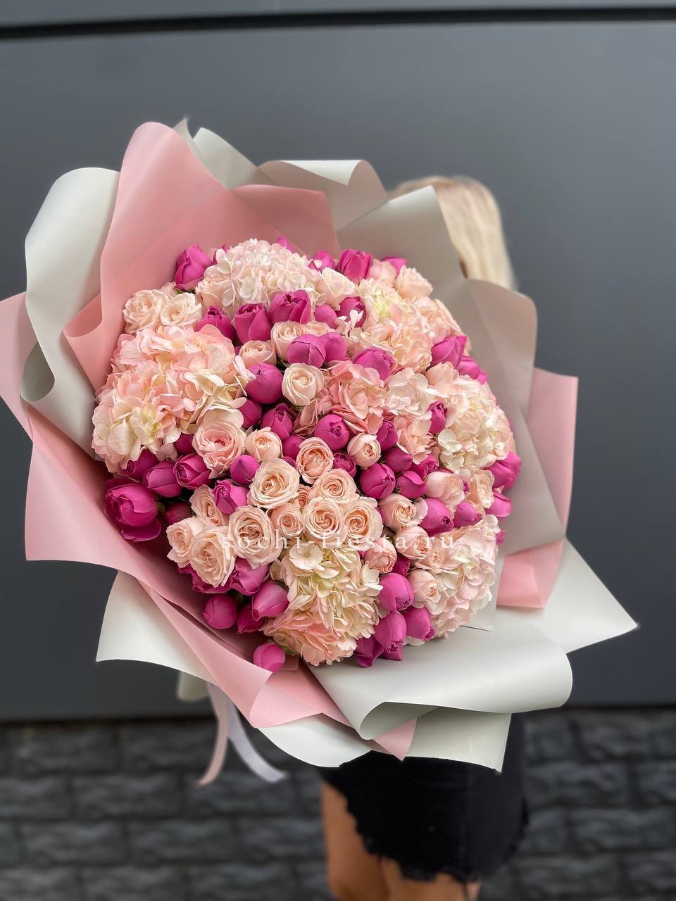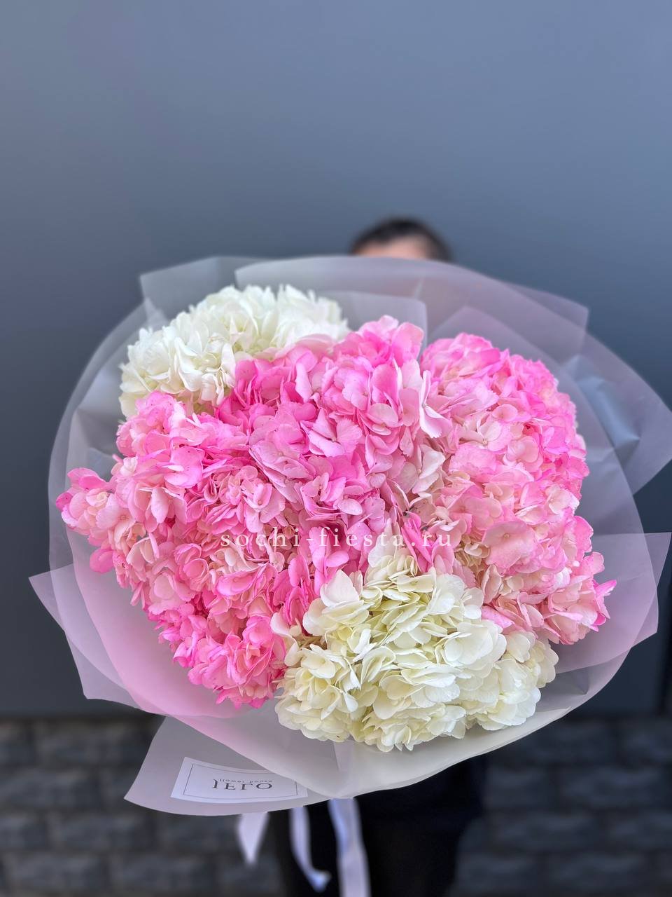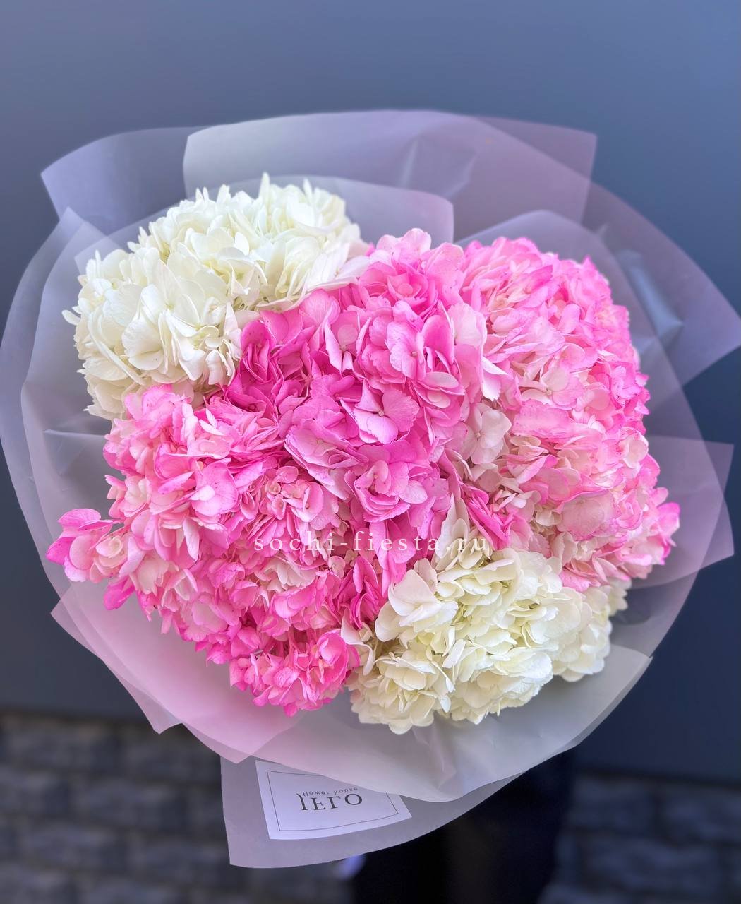 Пять крупных соцветий гортензии в бело-розовой гамме образуют воздушную композицию с переливами света на лепестках. Букет выглядит объёмно и свежо, наполняя пространство мягким цветом.