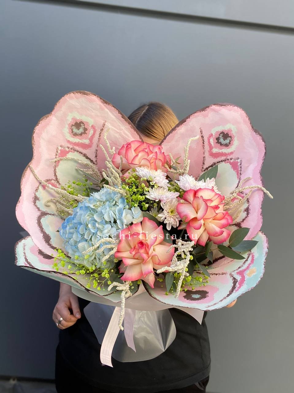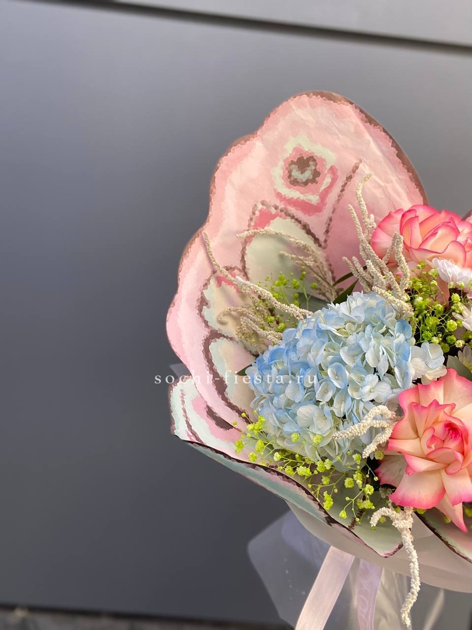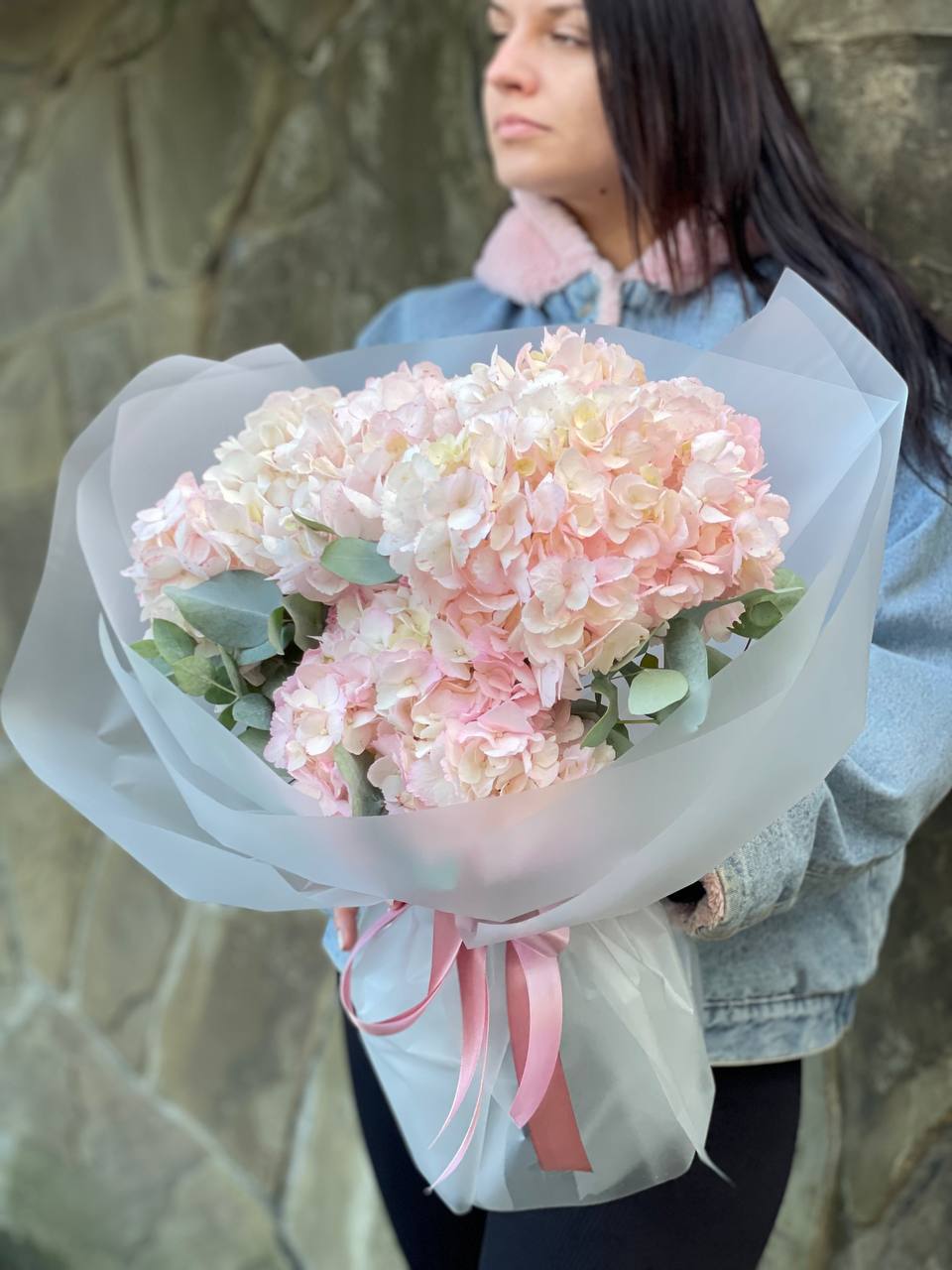 розовые гортензии, эвкалипт, пленка.