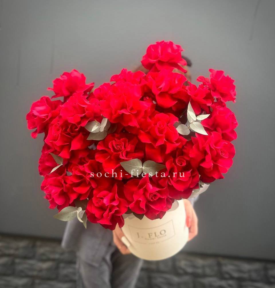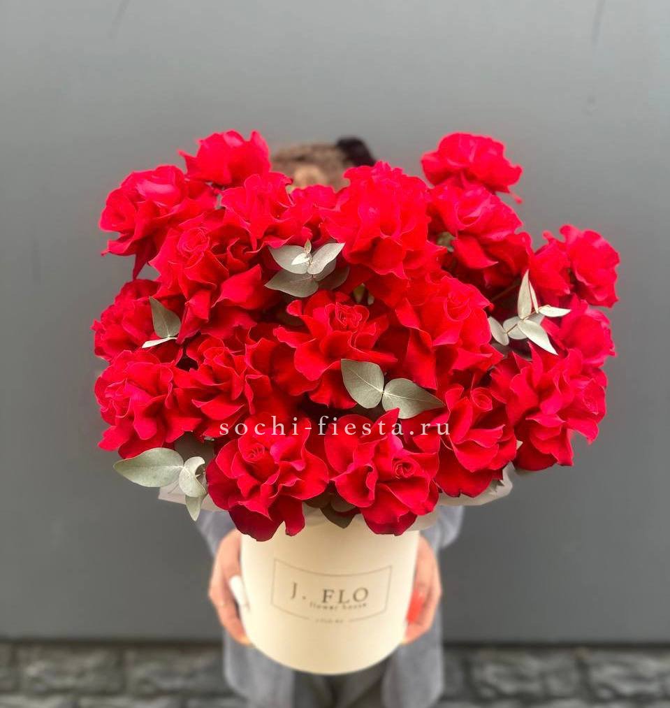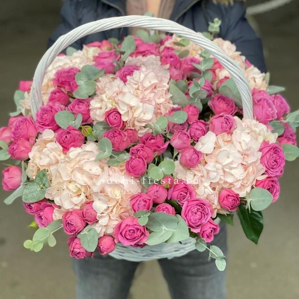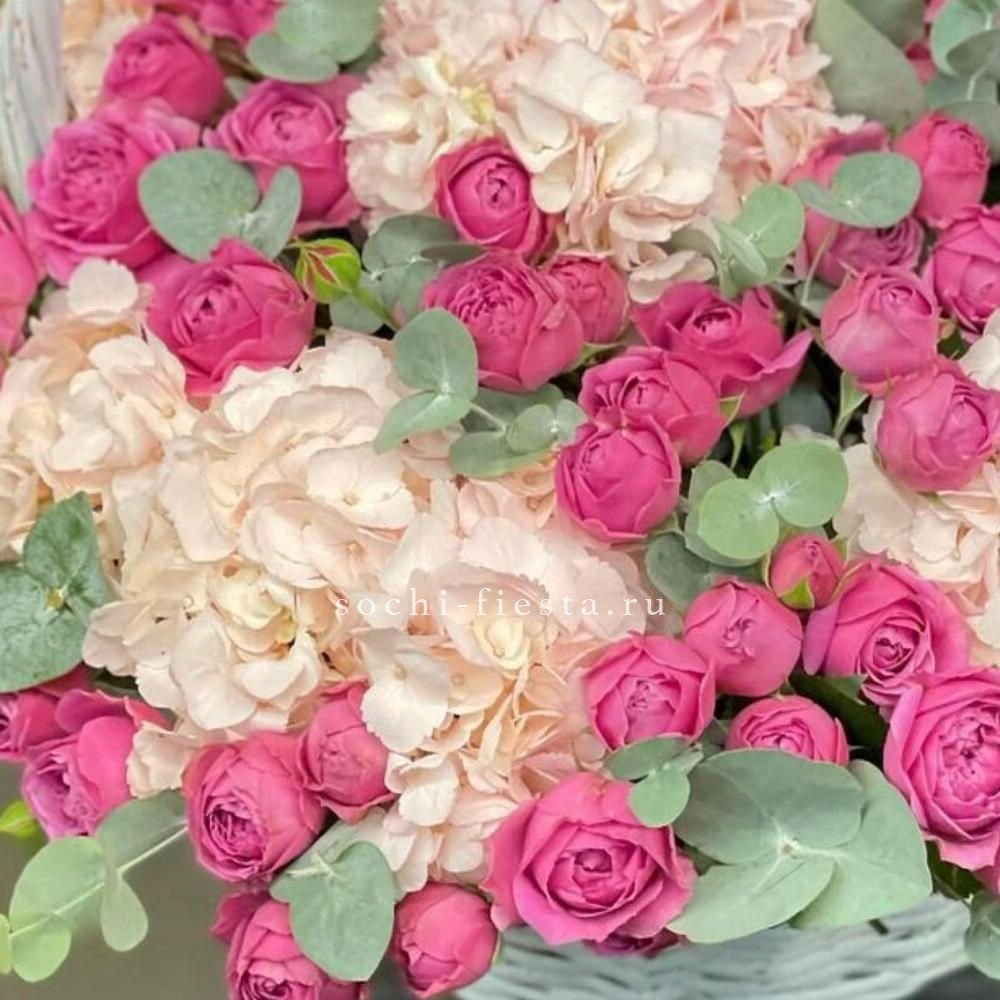 Крупные шапки гортензии встречаются с яркими кустовыми розами бомбастик и образуют насыщенную композицию с выраженным силуэтом. Ветки эвкалипта добавляют графичность и завершают авторскую подачу.