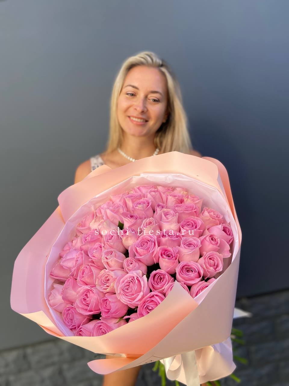 Пятьдесят пять бутонов создают объемную композицию с выразительным силуэтом. Розовый цвет наполняет пространство светом. Авторское оформление завершает образ.