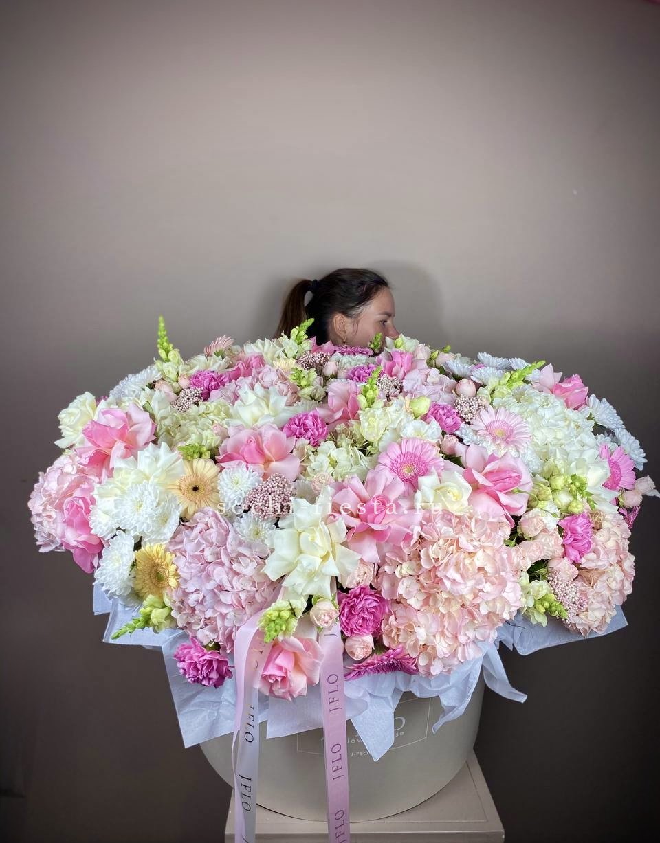 Семь пышных шапок гортензий переливаются от белого к розовому оттенку. Объёмная композиция заполняет собой всё вокруг и притягивает взгляд своей воздушной фактурой.