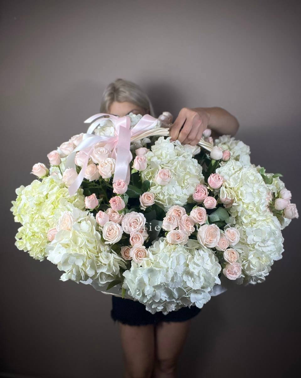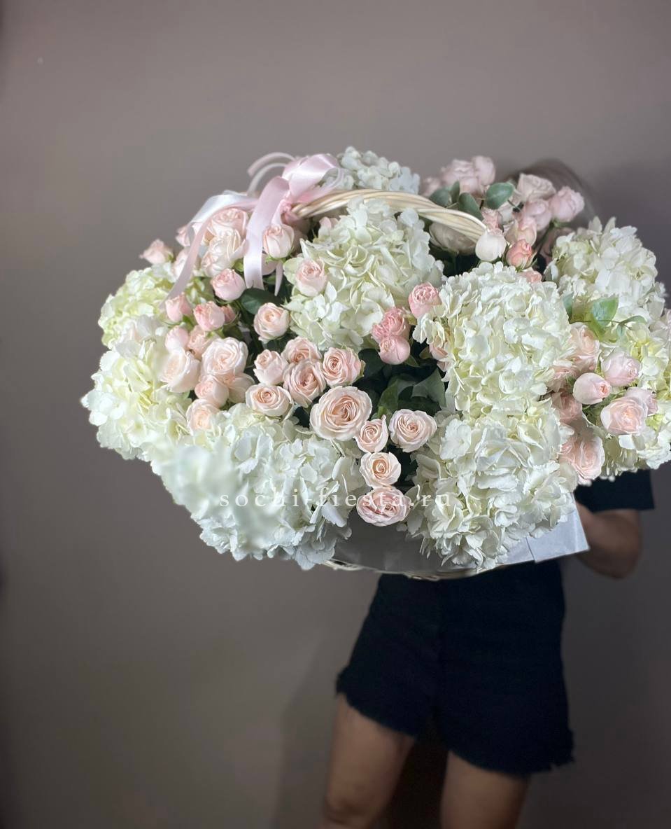 гортензия, хризантема, белая роза, гербера, статица, хлопок, упаковка.