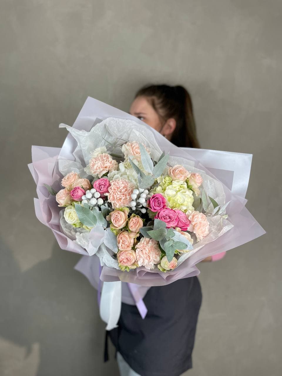 мисти бабблс, диантусы нежных оттенков, эвкалипт, авторское оформление.