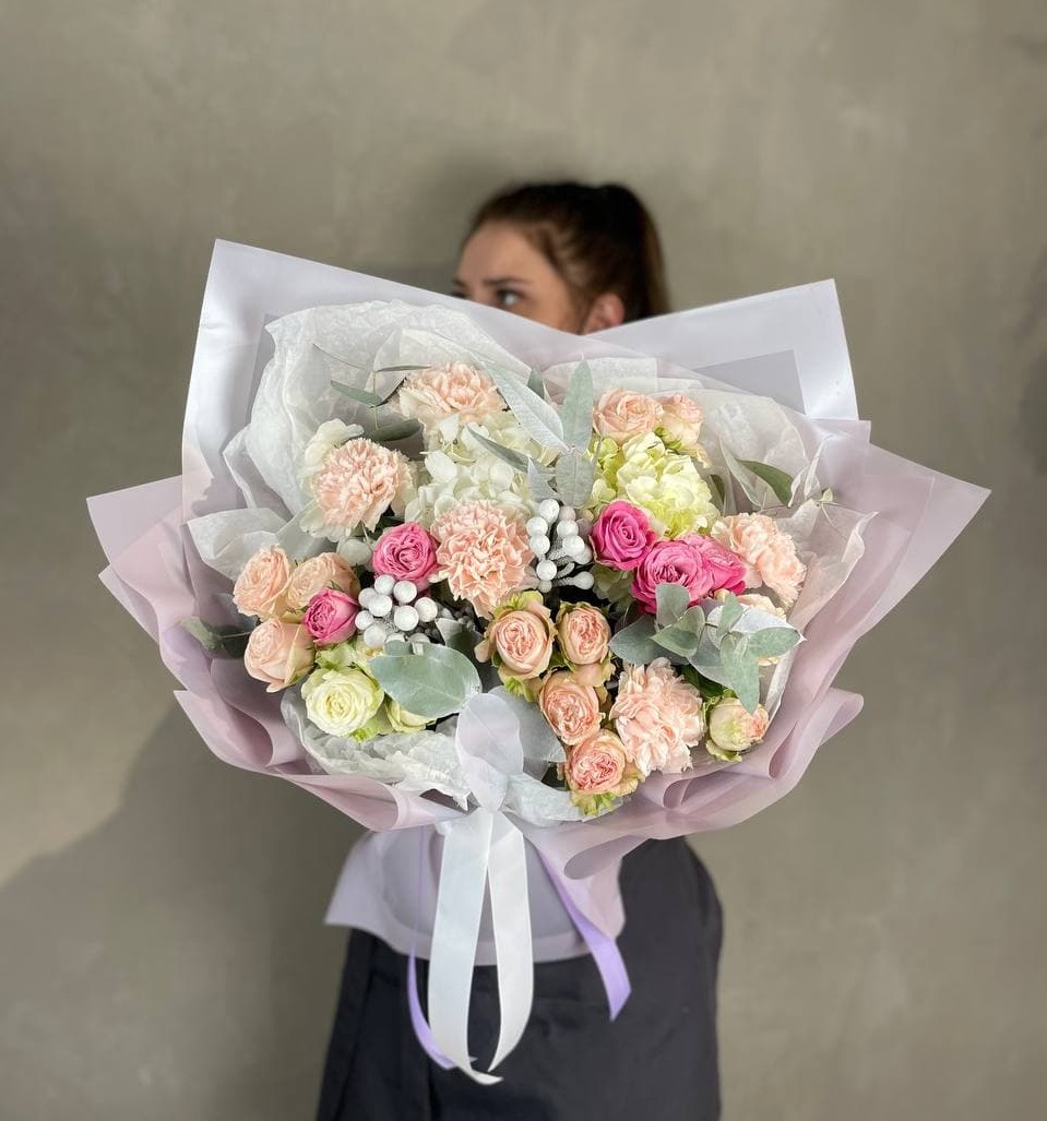 Воздушные кисти мисти бабблс переплетаются с яркими диантусами создавая объёмную текстуру. Эвкалипт добавляет свежести и завершает композицию лёгкими зелёными нотами.