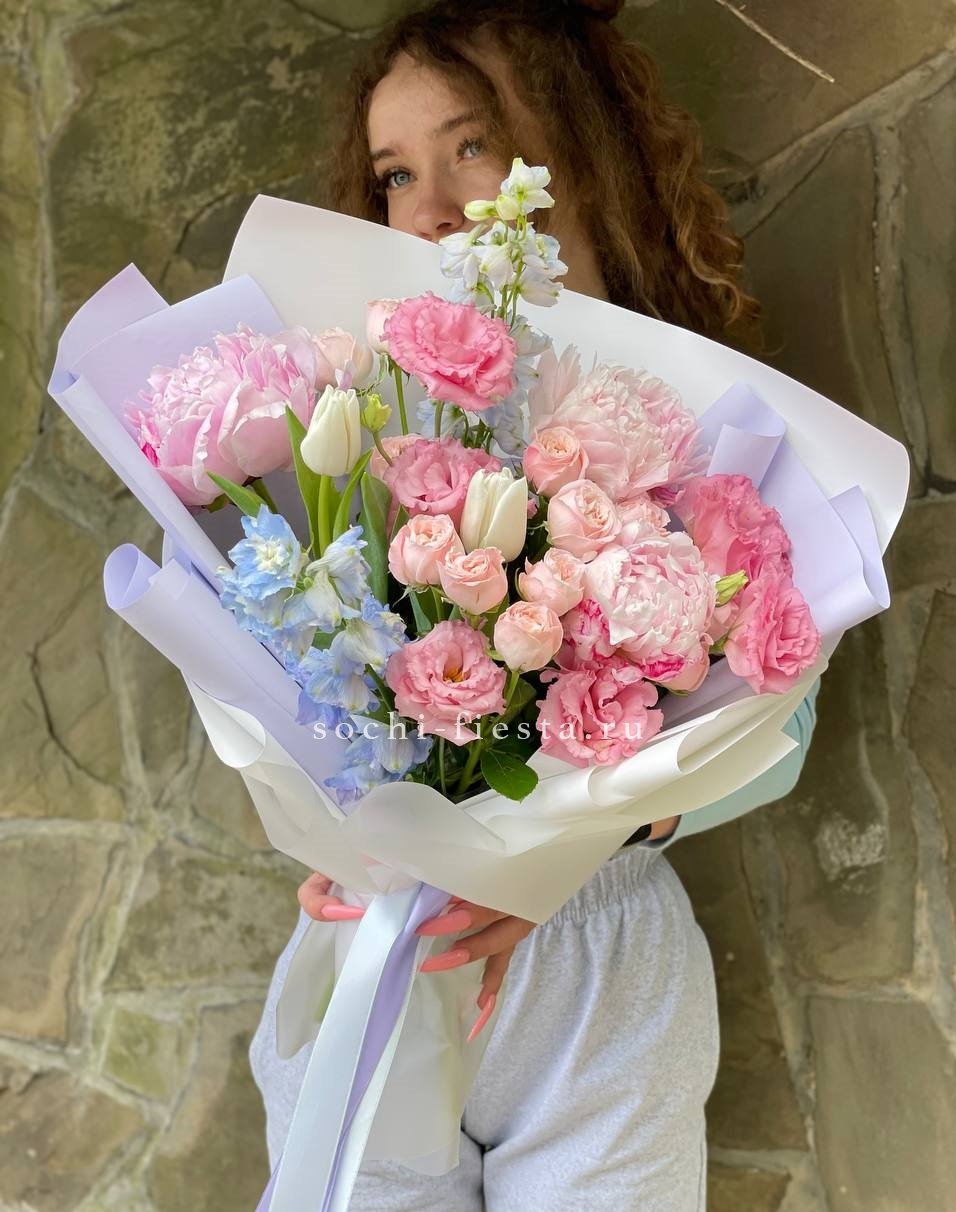 эустома, розовые пионы Сара Бернар, пионовидные розы, дельфиниум (замена вне сезона), тюльпан (замена вне сезона), лента, дизайнерская упаковка.