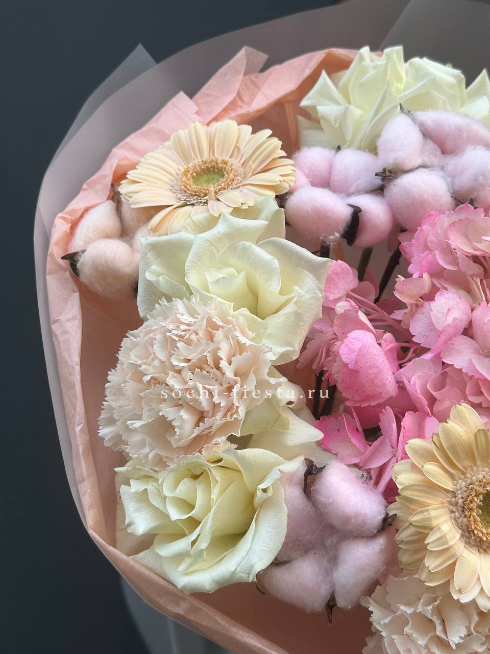 Белые розы, герберы и соцветия гортензии образуют плотную композицию с чёткими линиями. Эустома добавляет воздуха между крупными бутонами, а дизайнерская упаковка завершает форму.