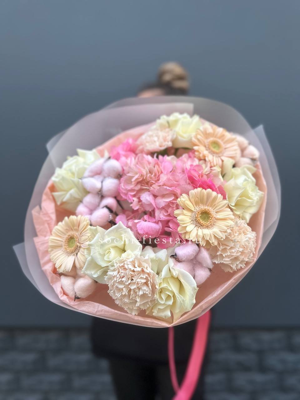 гортензия, герберы, белые розы, эустома,  лента и дизайнерская пленка.