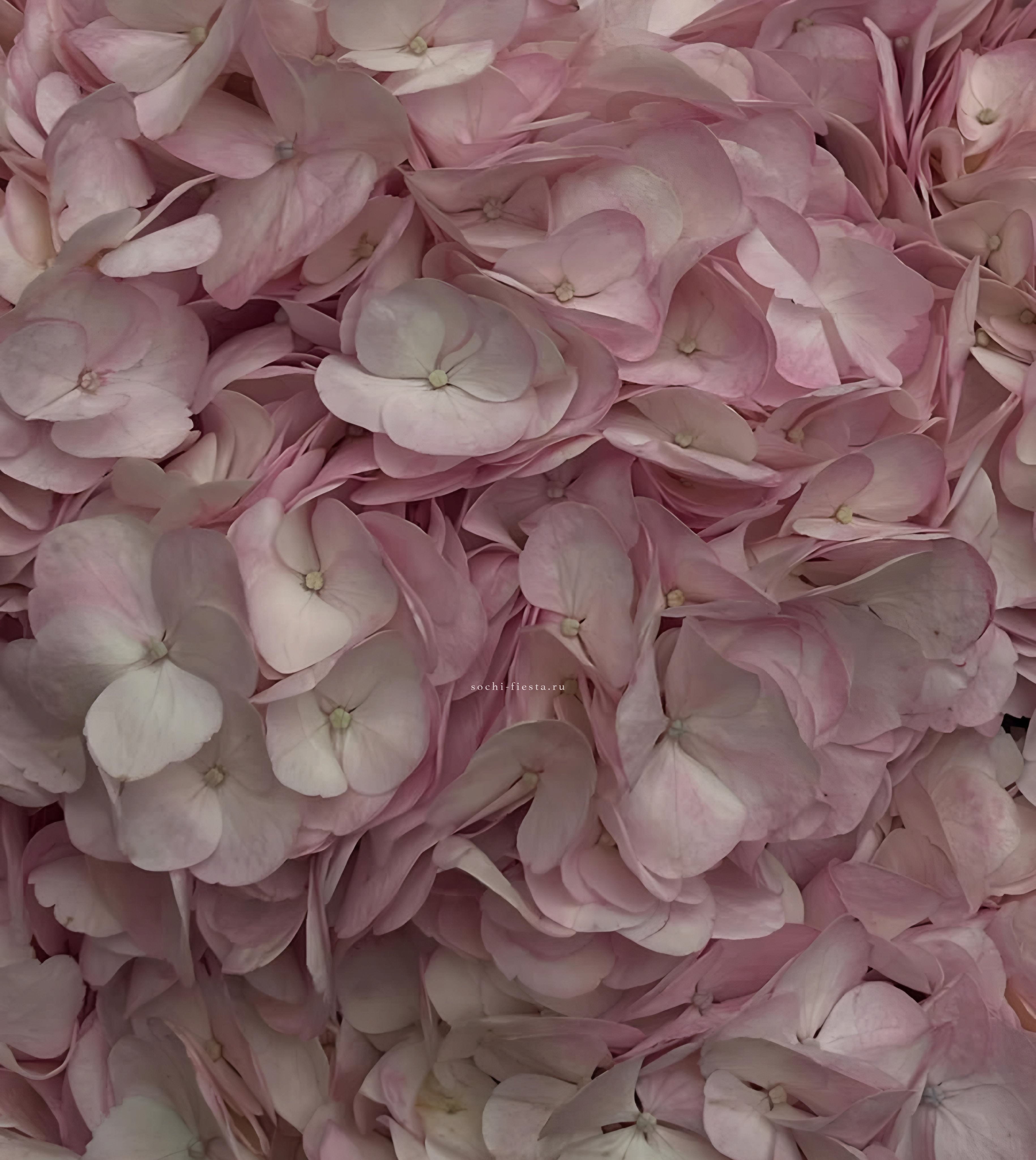 Букет из семи гортензий объединяет разные оттенки в единую композицию с живым ритмом. Переходы цвета создают динамику, а плотные соцветия формируют выразительный объём.