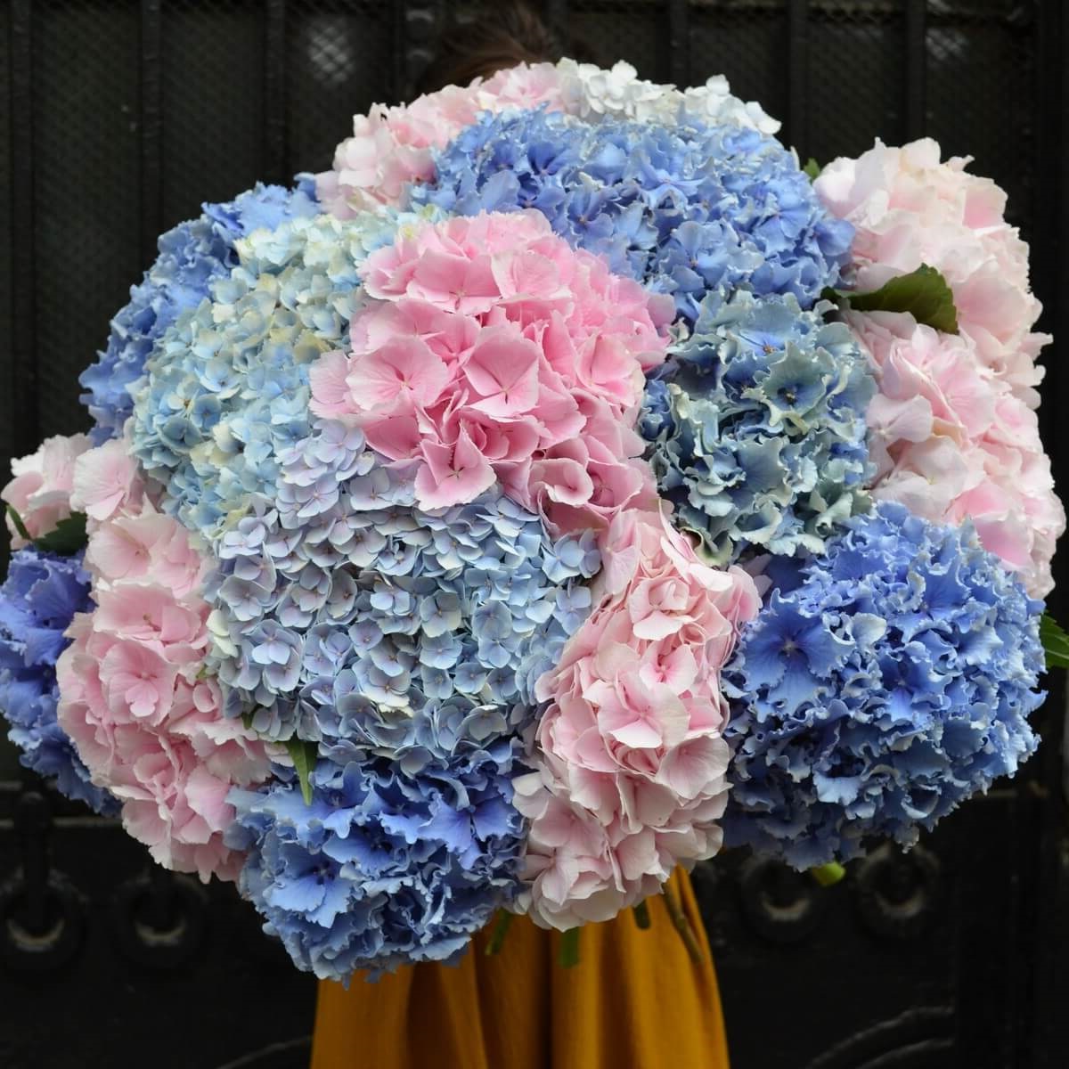Двадцать одна гортензия разных оттенков собрана в пышную охапку с мягкими переходами цвета. Шаровидные соцветия создают плотную текстуру, а их природная стойкость позволяет наслаждаться букетом долго.
