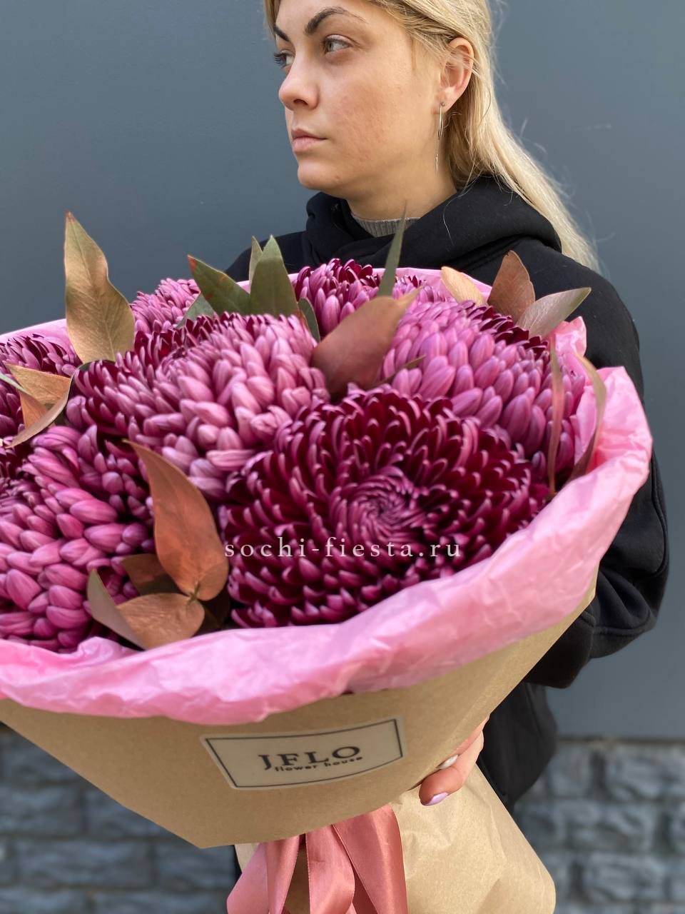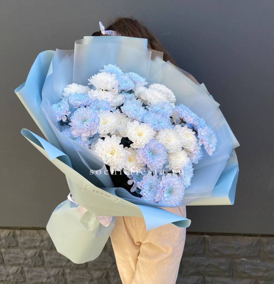 Семь пышных соцветий хризантемы с игривыми завитыми лепестками собраны в плотную композицию. Золотистый эвкалипт добавляет теплое мерцание и завершает образ. Яркий жест для тех, кто любит выразительные формы и живую энергию цветов.