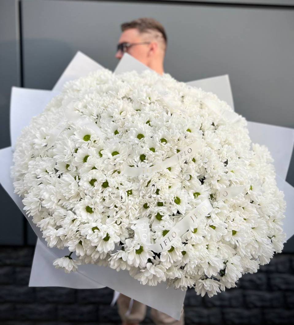 Тридцать девять белоснежных хризантем образуют плотное облако с чёткими графичными линиями. Крупные соцветия создают объёмную структуру, которая держит форму и привлекает внимание своей архитектурой.