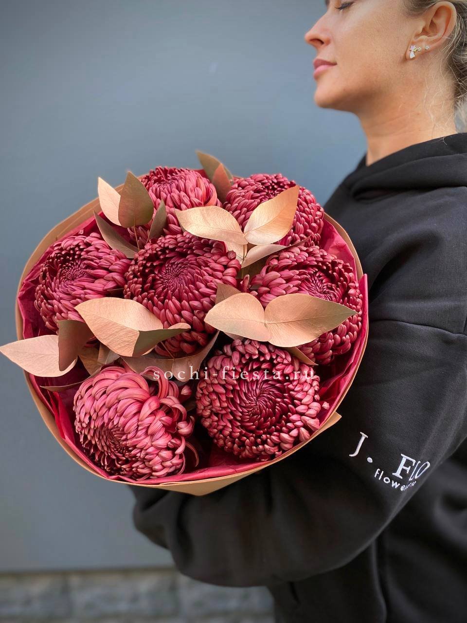 Теплый шоколадно-золотой оттенок хризантем создает уютное осеннее настроение. Семь пышных соцветий собраны в компактную композицию с веточками эвкалипта.