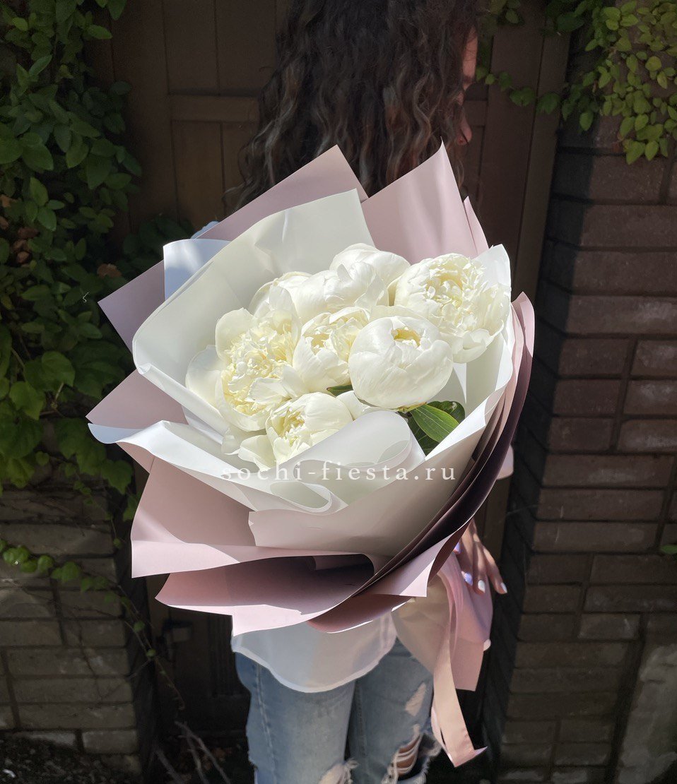 белые пионы, лента, дизайнерская упаковка.