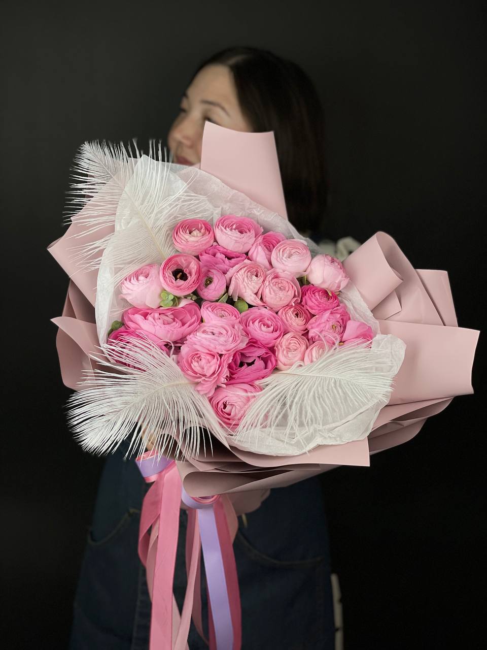 Двадцать пять розовых ранункулюсов раскрываются пышными головками, создавая воздушное облако из многослойных лепестков. Страусиные перья добавляют композиции графичности и легкости.