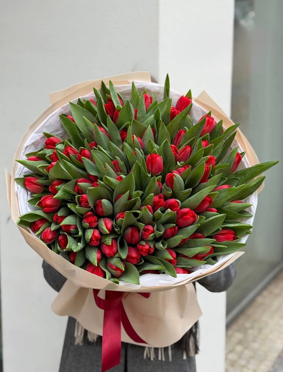 Тридцать семь тюльпанов создают яркое цветовое пятно в любом интерьере. Крафтовая упаковка оставляет композицию открытой и подчёркивает графику стеблей. Букет выглядит свободно и современно.