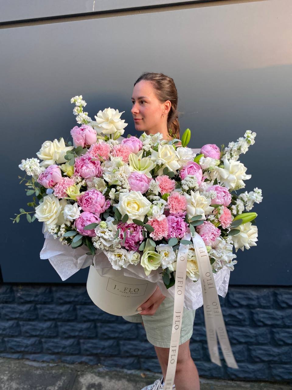 пионы, лилии, белые розы, эустомы, диантусы, маттиолы, статица, альстромерия, эвкалипт, цилиндр - D25, лента, упаковка. Состав может меняться в зависимости от сезона.