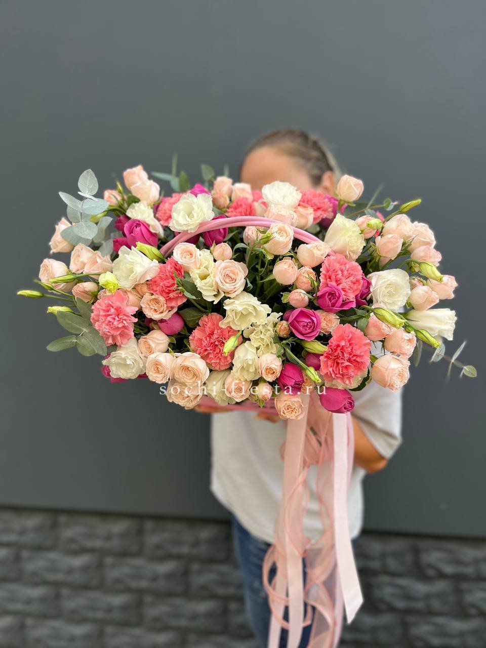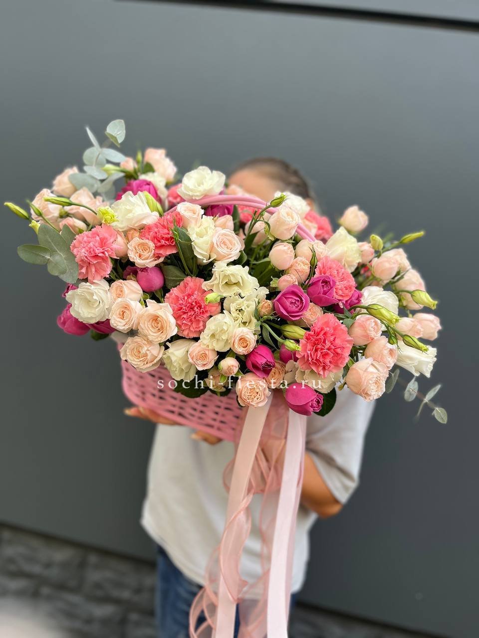 розовая роза, пионовидная роза, диантус, эвкалипт, лента, сумка-кашпо.