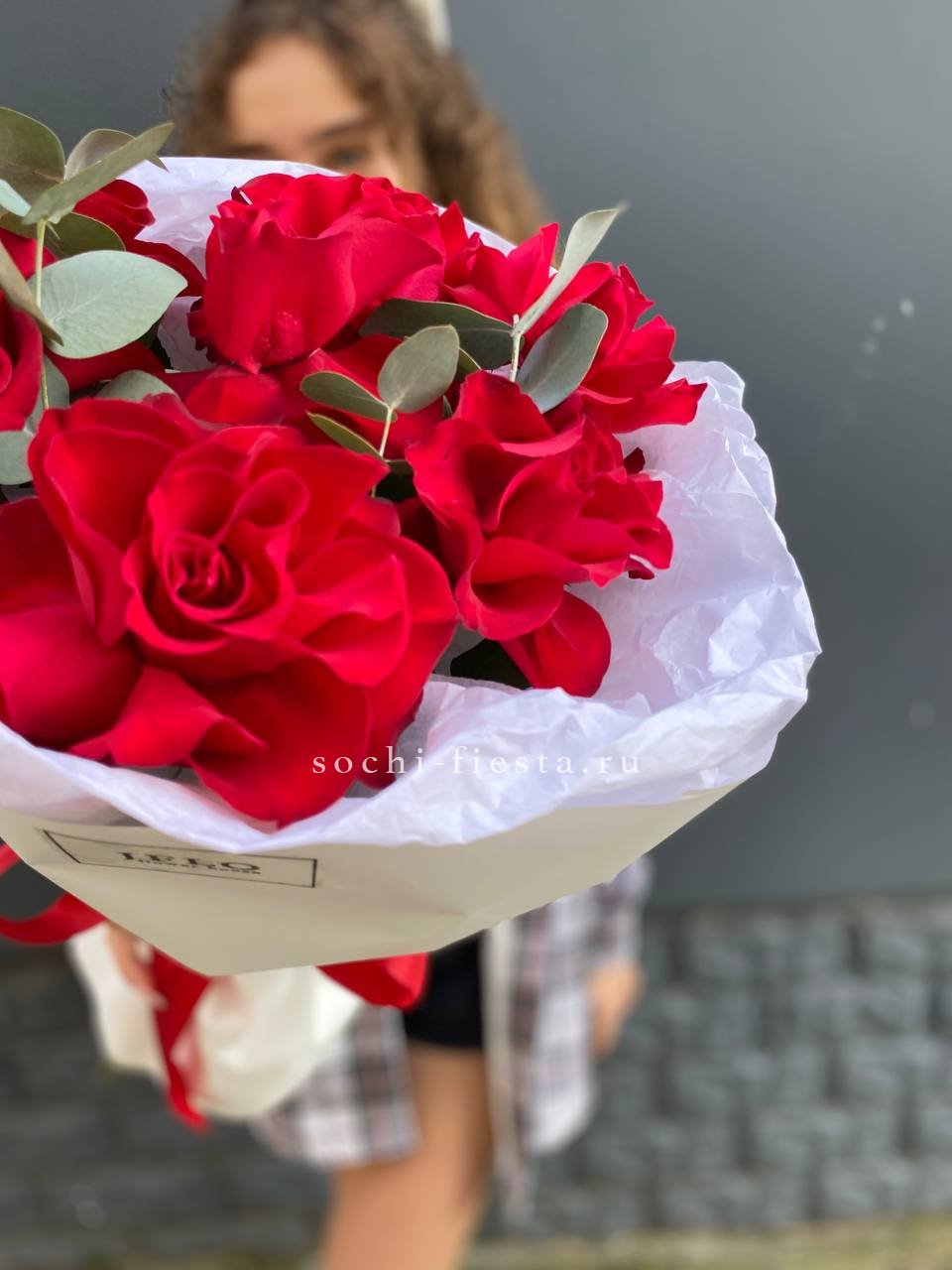 кустовые пионовидные розы Бомбастик, эвкалипт, цилиндр D13, бумага тишью, лента.