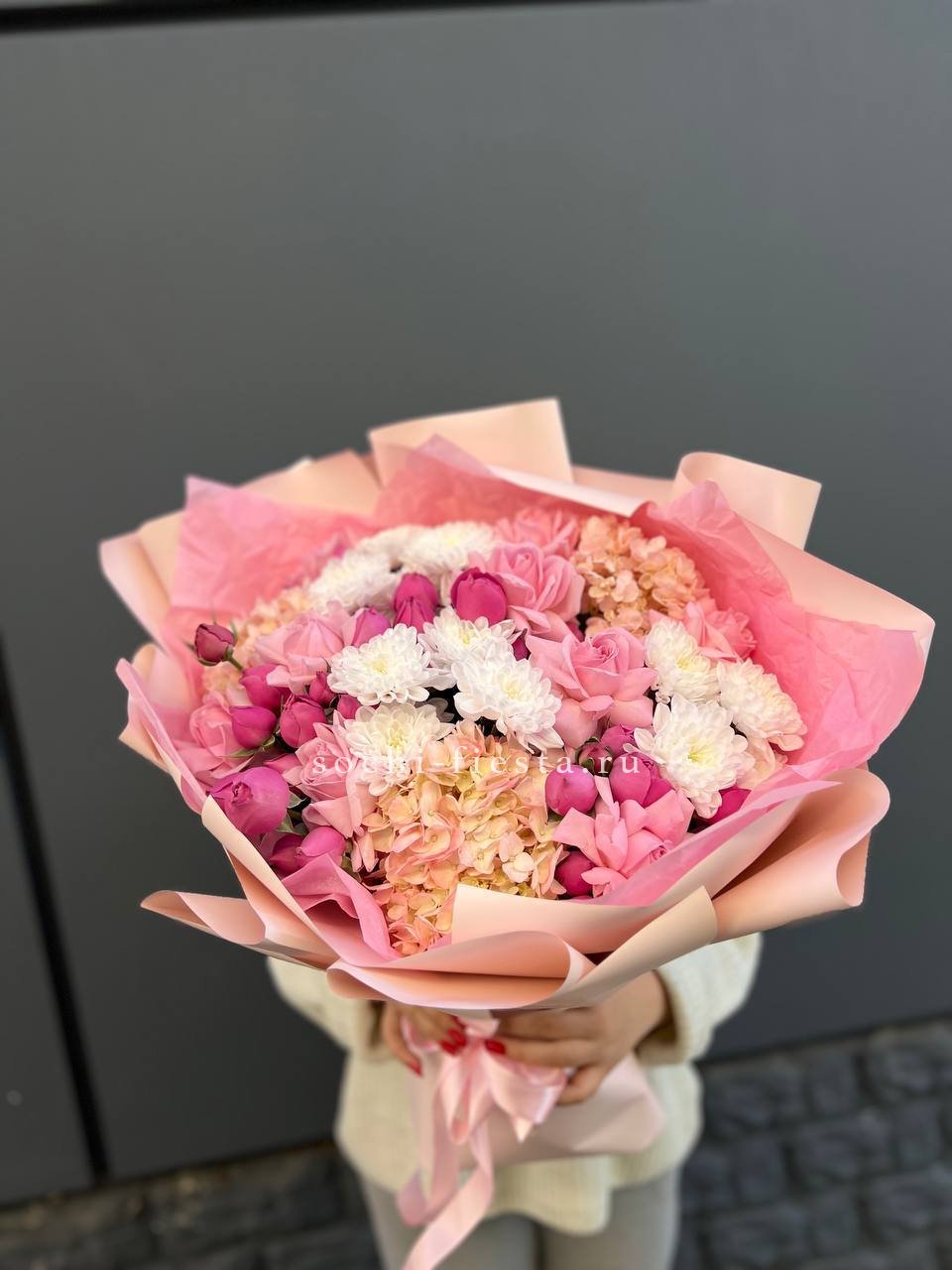 гортензия розовая, лента, дизайнерская упаковка. Цвет гортензий может незначительно отличаться.