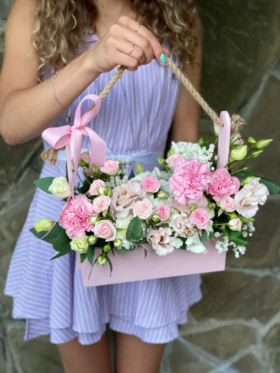 розы, диантусы, эустома, деревянный ящик с колбами.