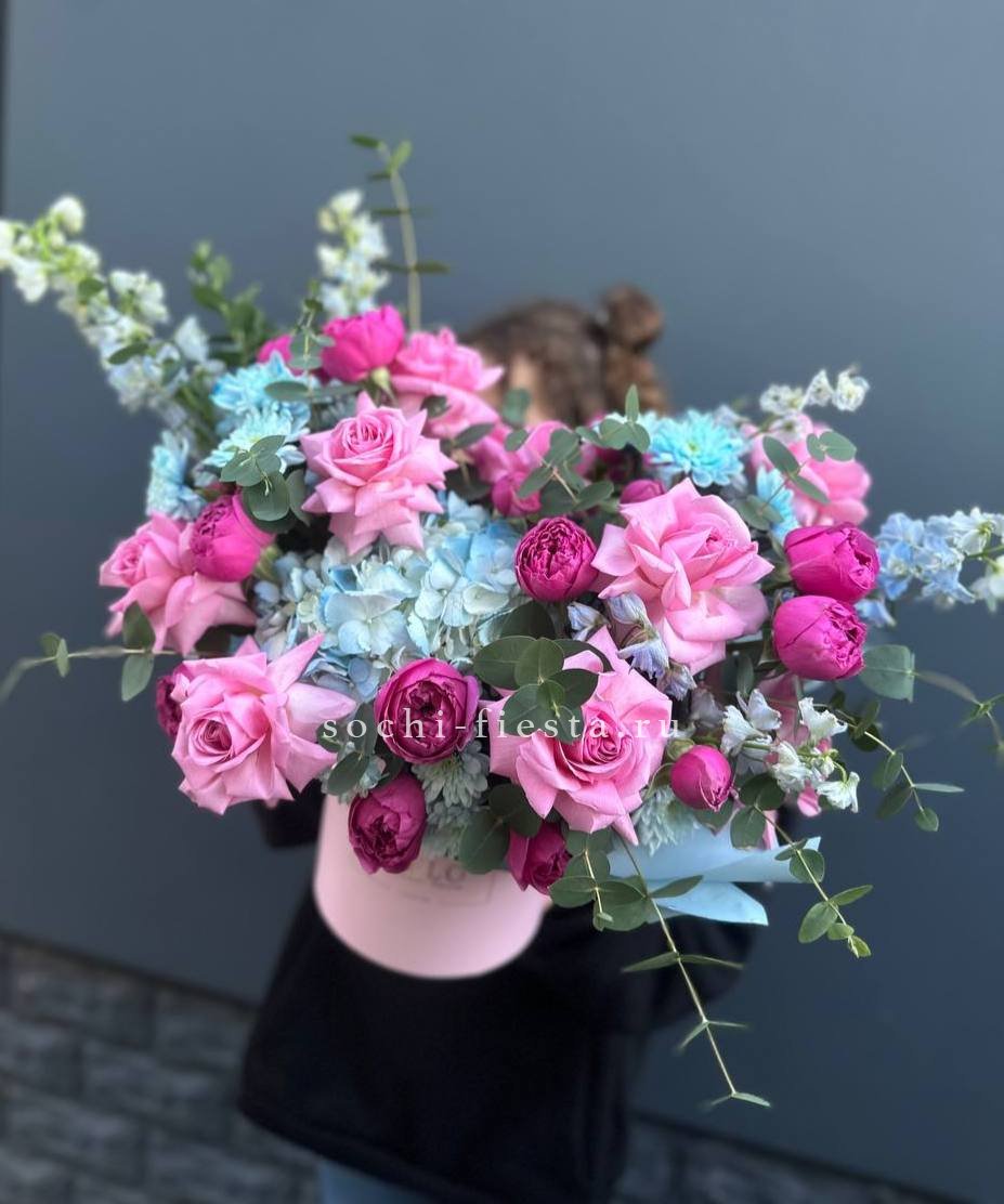 Гортензия и пионовидные розы задают плотную основу, маттиола или дельфиниум вытягивают композицию вверх. Объемная коробка вмещает многослойную структуру из разных форм и высот.