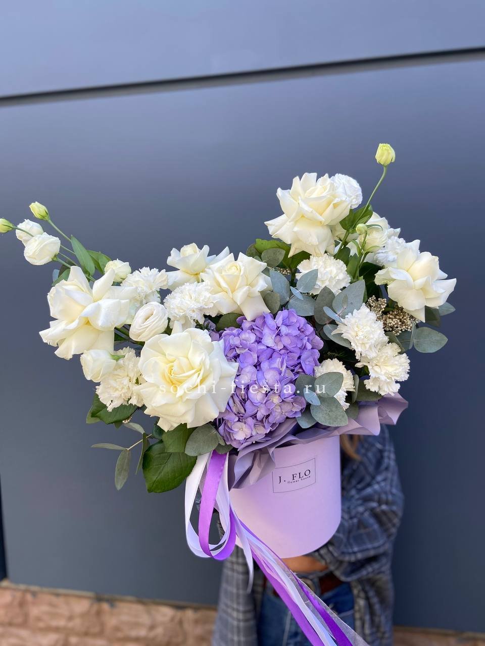 Белоснежная гамма раскрывается через лилии, розы и пышную гортензию с добавлением диантуса. Эвкалипт придает объём и глубину всей композиции в цилиндре.