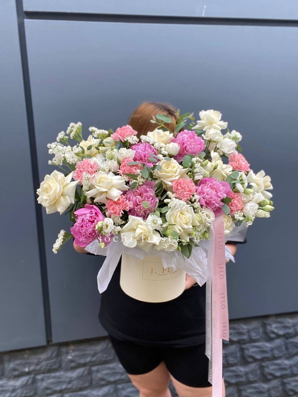 пионовидная кустовая роза, гортензия, одноголовая роза, эустома, бавардия, бокс D20.