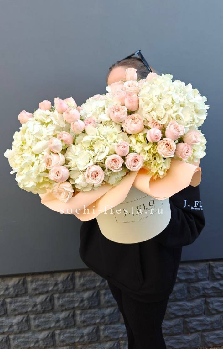 Пионовидные бутоны и шапки гортензии заполняют бокс густой textured массой. Композиция держит форму и создаёт ощущение цветочной волны в ограниченном пространстве.