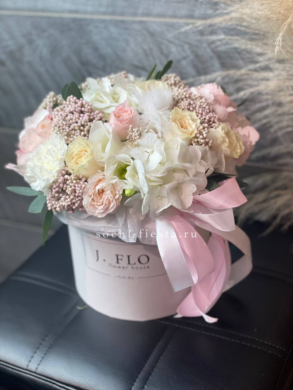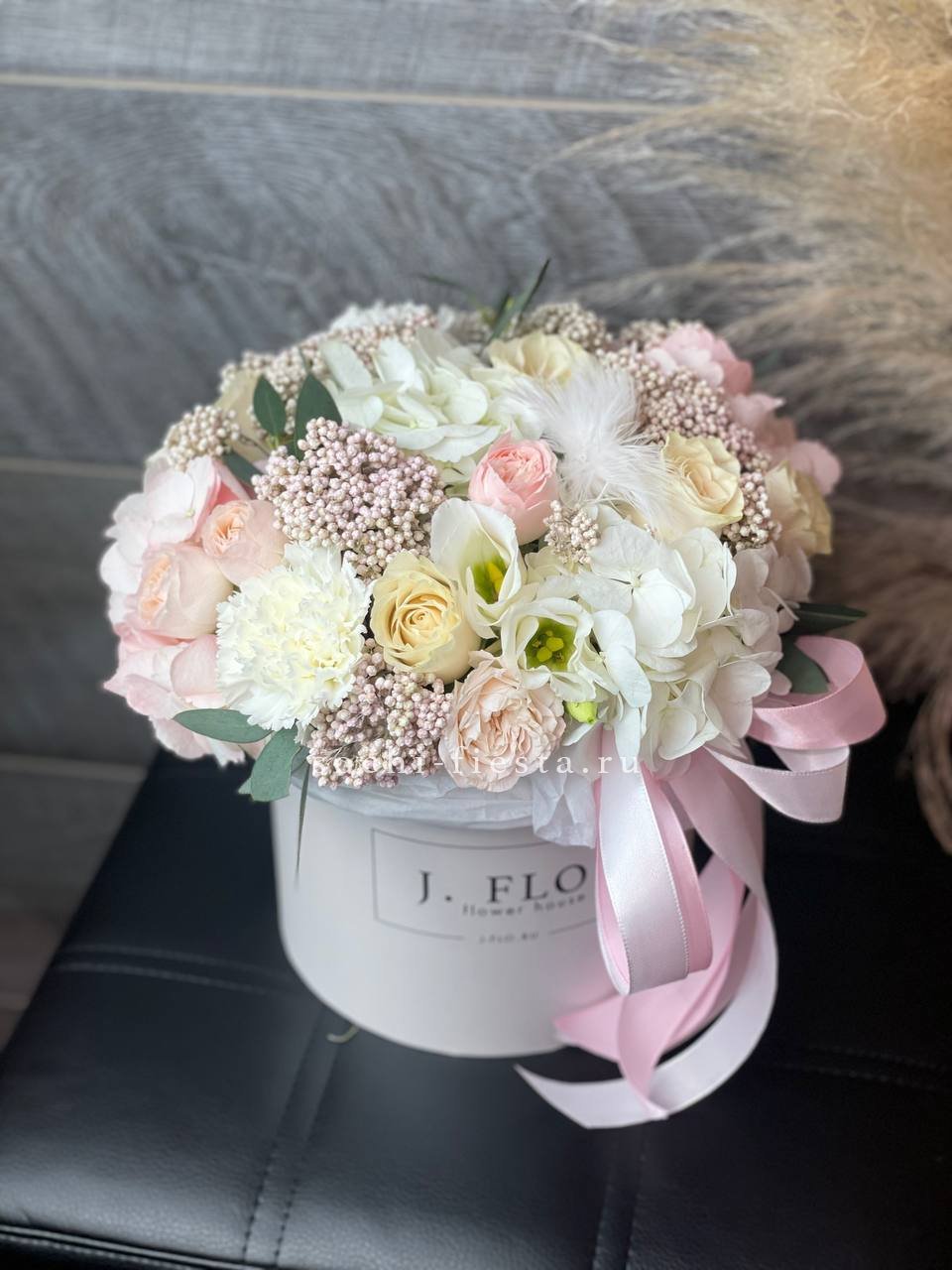 Эвкалипт обрамляет кустовые розы и гортензию, создавая многослойную структуру с зелеными переходами. Эустома добавляет легкости, а цилиндр держит форму аккуратной и собранной.