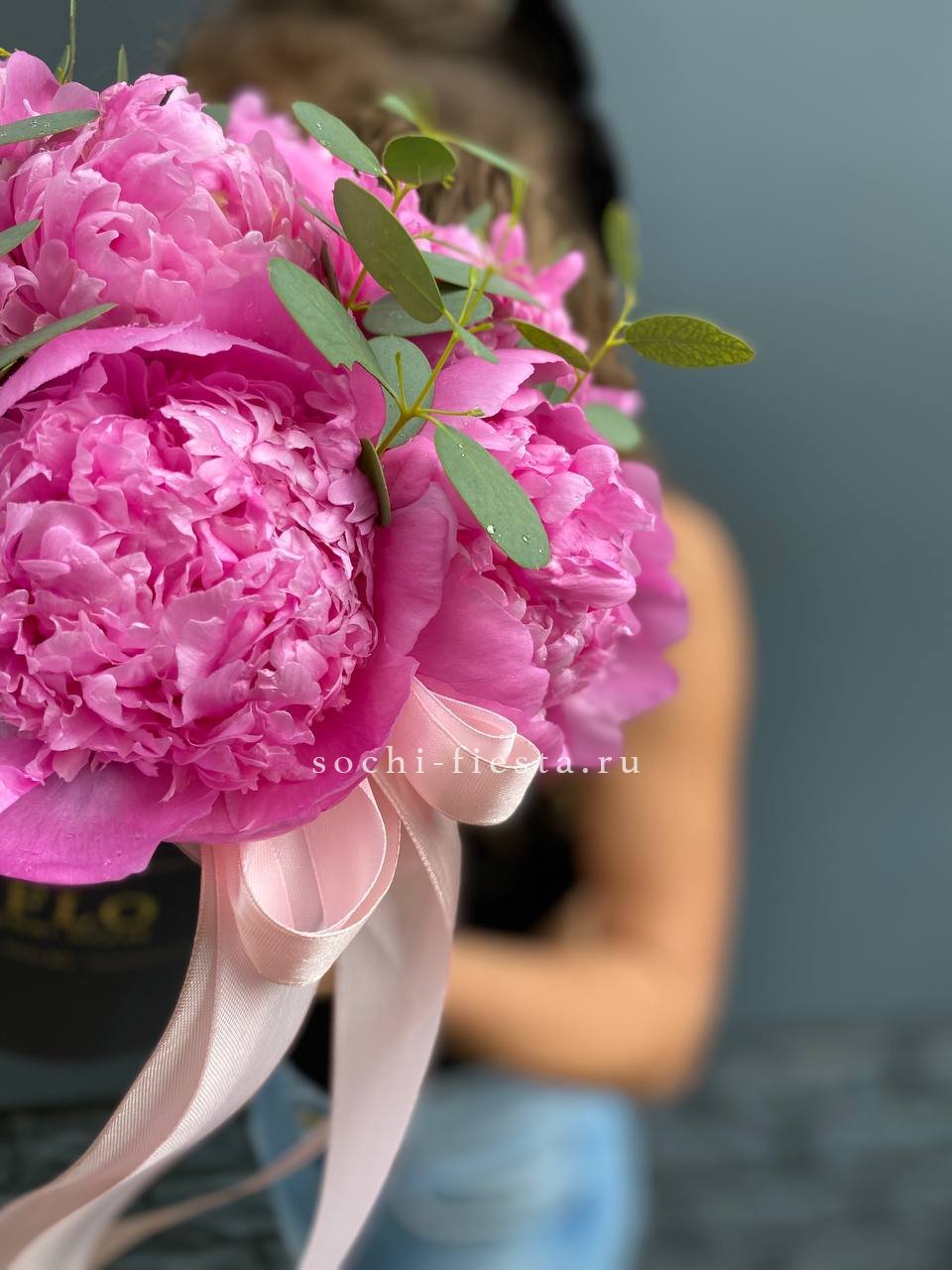 Семь пионов раскрываются пышными шапками в компактном цилиндре. Каждый бутон демонстрирует многослойную структуру лепестков, а эвкалипт обрамляет композицию лёгким серебристым кольцом.