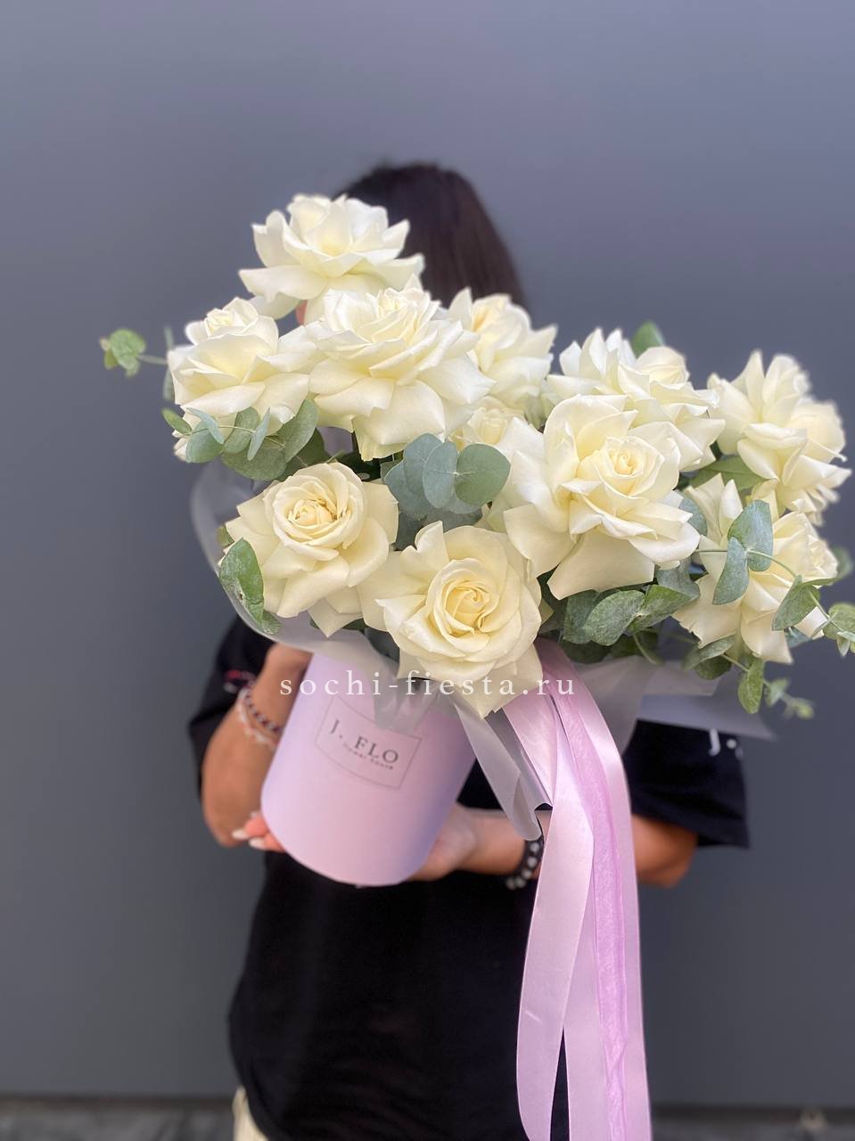 вывернутые белые розы, цилиндр D13, эвкалипт, лента, упаковка.