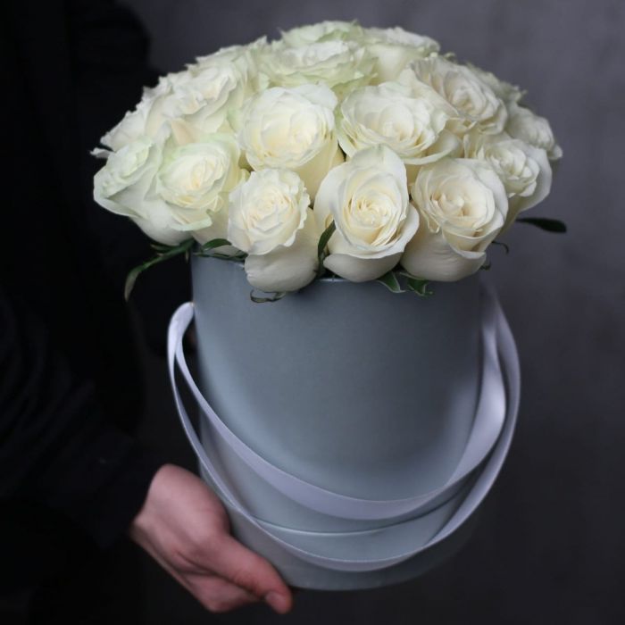 Одиннадцать вывернутых французских роз образуют плотную округлую форму в компактном цилиндре. Белоснежные бутоны с крупными лепестками выглядят свежо и современно.