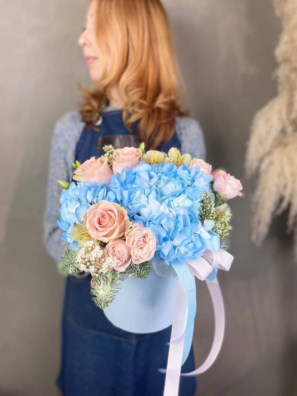 гортензия, пионовидные кустовые розы, озотамнус (или аналог), сезонный цветок, шляпная коробка D20, тишью.