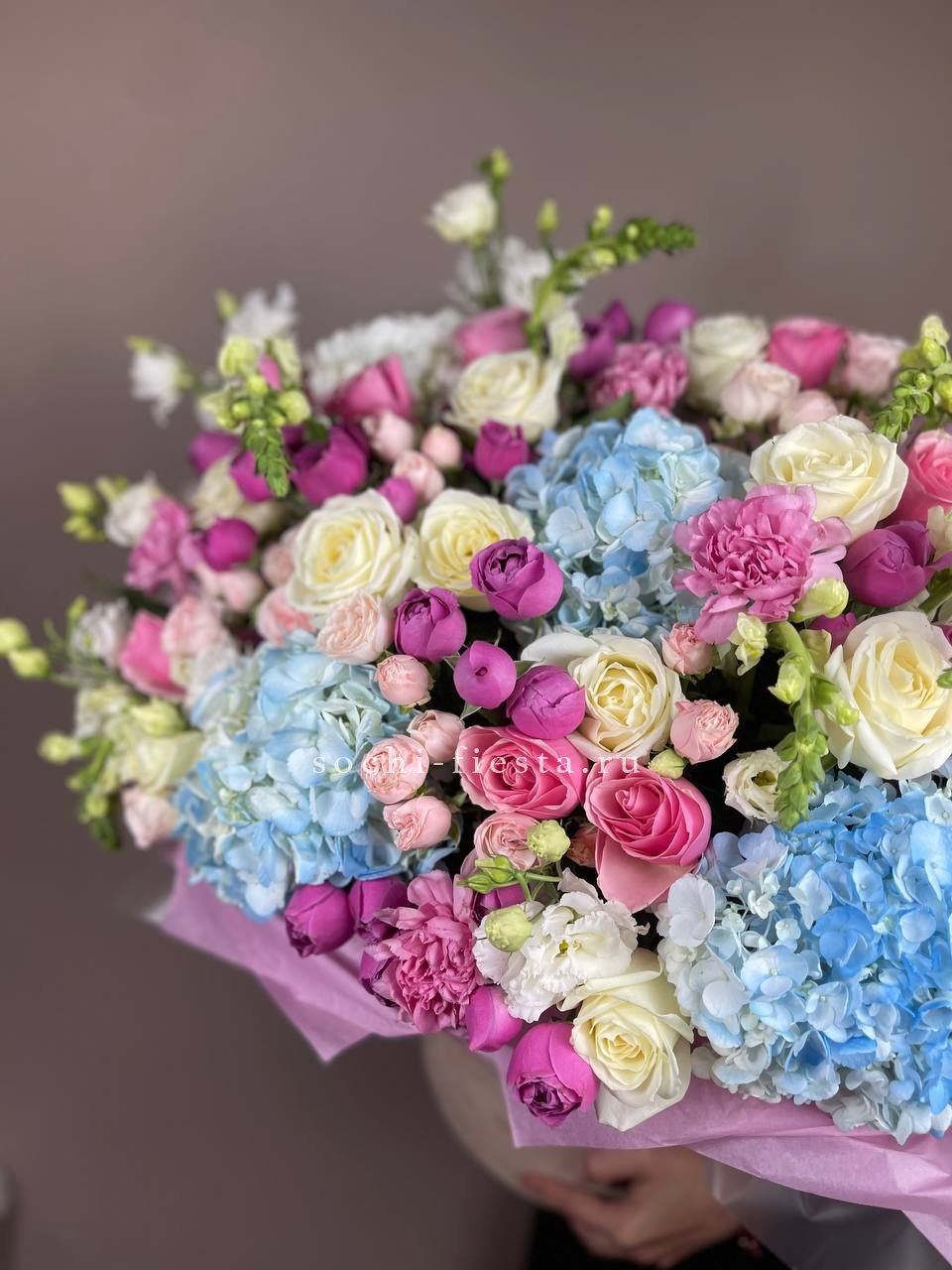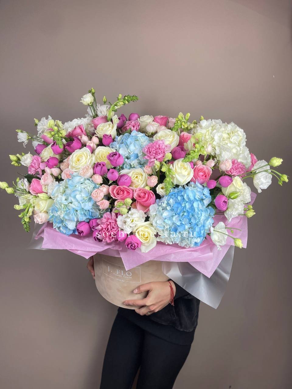гортензия, пионовидные розы, эустома, эвкалипт, бокс 16.