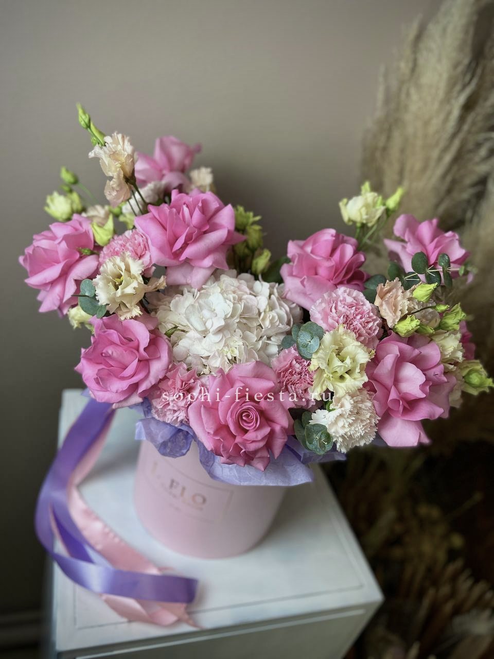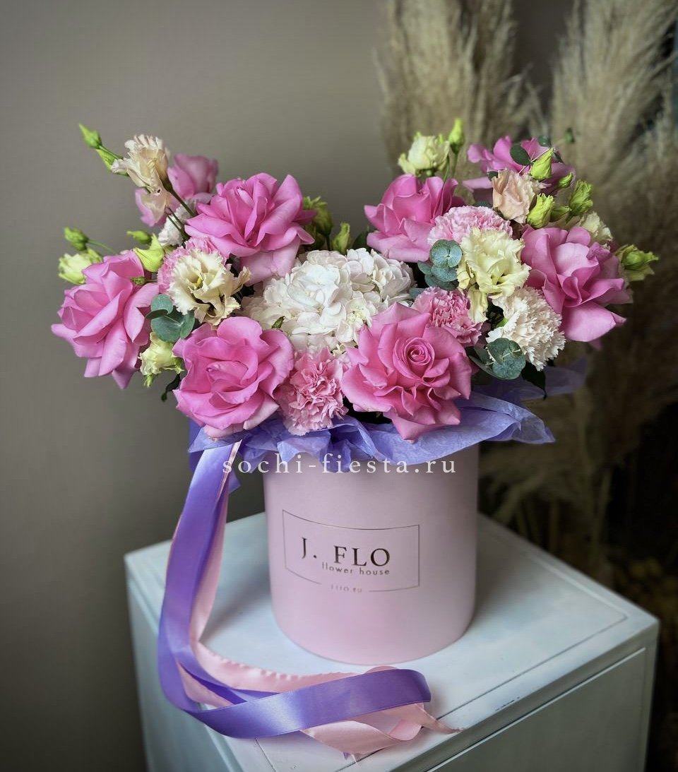 Розовая палитра переходит от французских роз к кустовым Джульетта с добавлением хлопка. Композиция в цилиндре сочетает воздушность и плотность фактур.