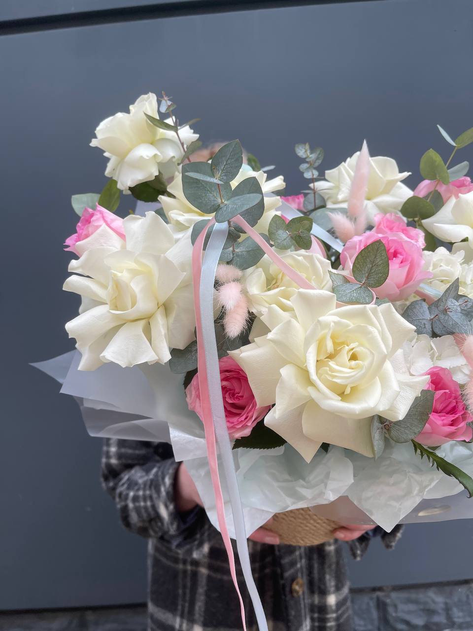 роза французская, эвкалипт, лист Чико (аналог), джутовое кашпо, оазис.
