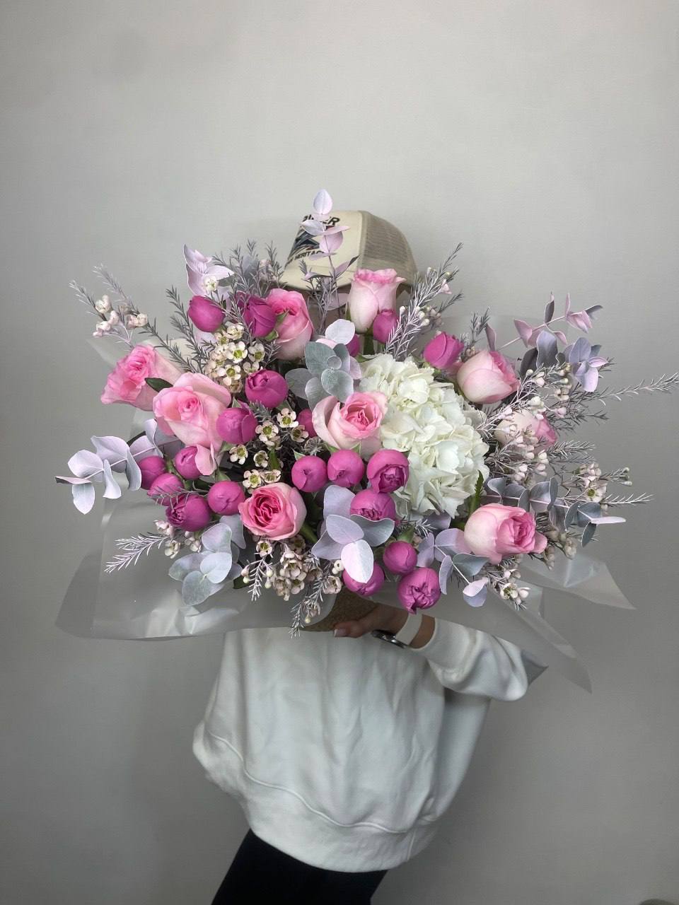 Пионовидные розы Мисти Бабблс с пышными многослойными бутонами создают объемную текстуру. Воздушная стифа и эвкалипт добавляют композиции легкости.