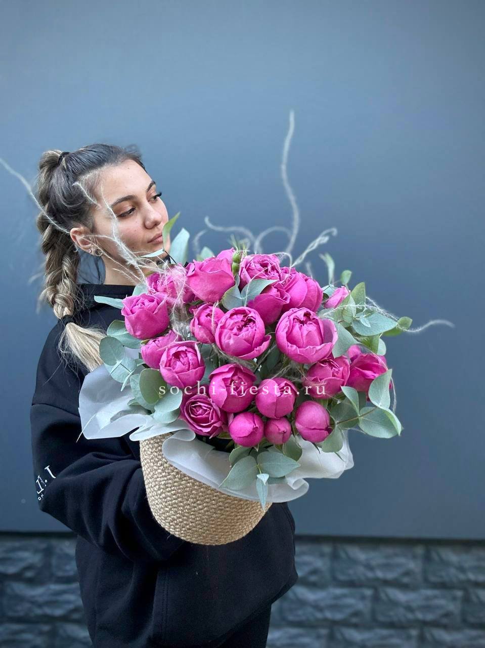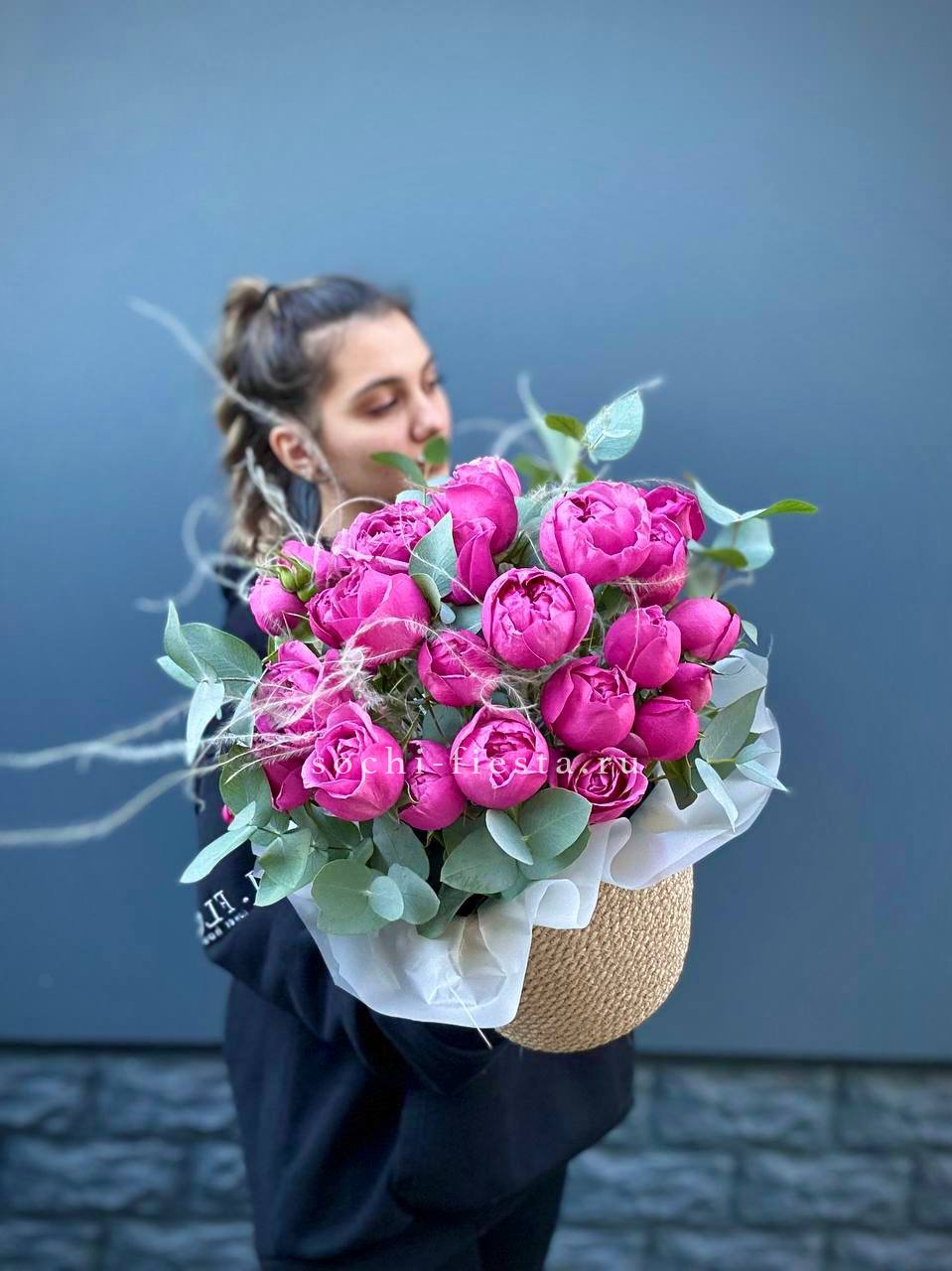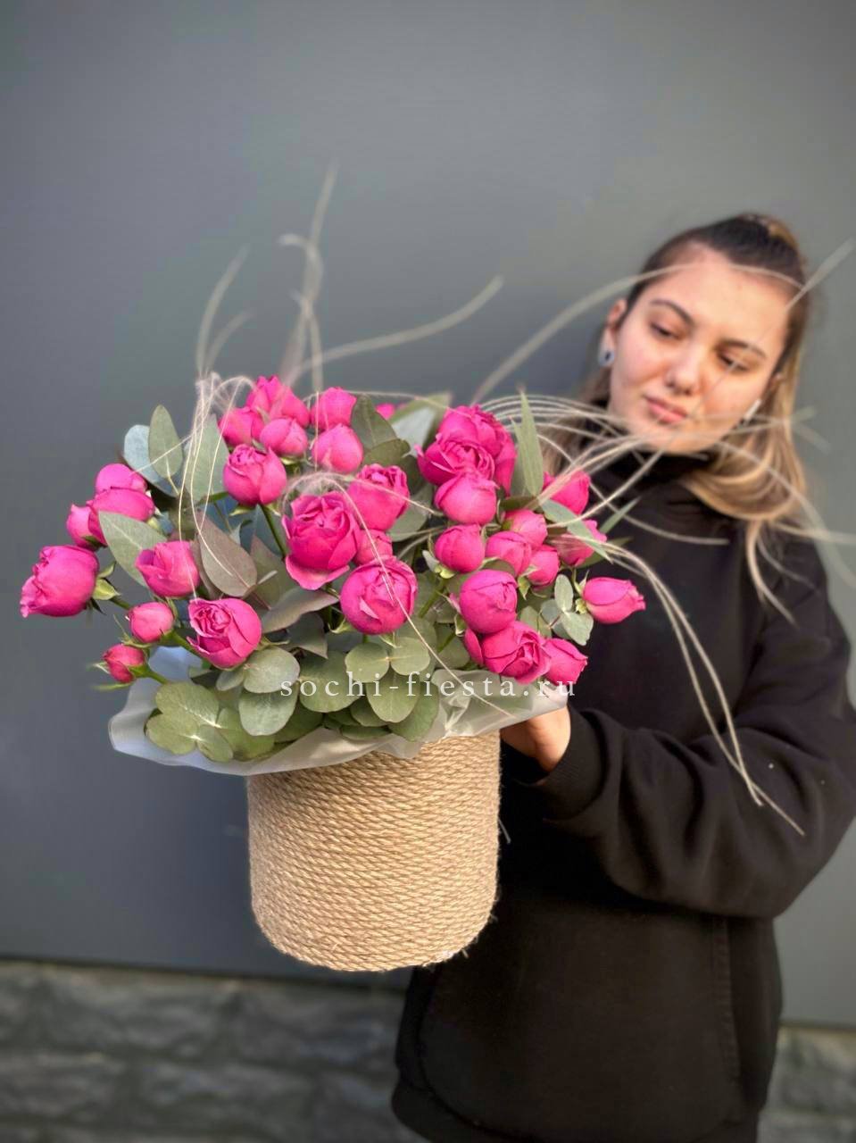 пионовидные розы Мисти Бабблс, джутовое кашпо, стифа, эвкалипт.