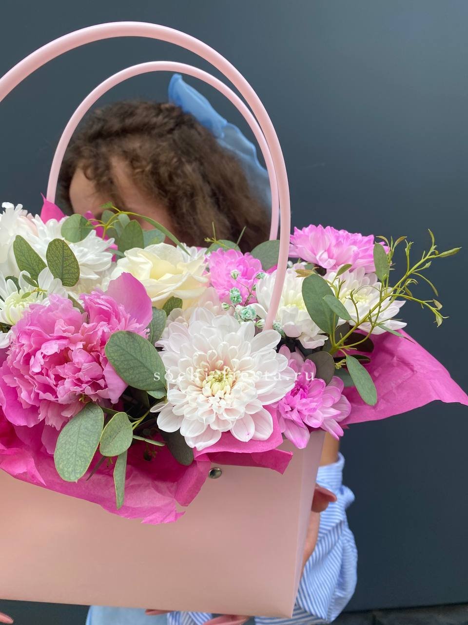 хризантемы, пионы, лента, сумка-кашпо.