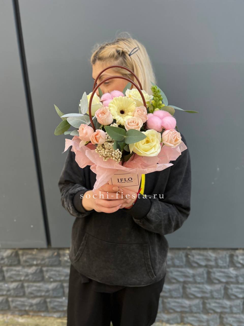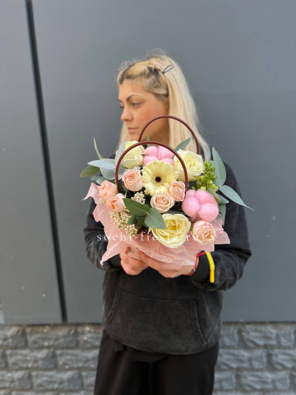 Хризантемы с пушистыми коробочками хлопка создают теплую домашнюю композицию в удобной сумочке. Цветы долго радуют взгляд и не требуют сложного ухода. Формат подходит для размещения в любом уголке дома.