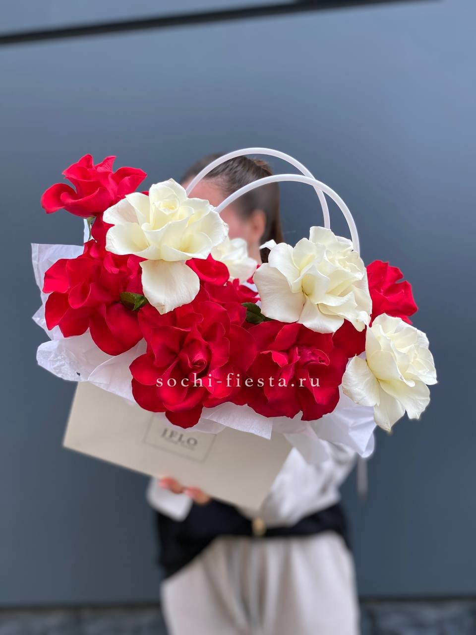 Французские розы двух оттенков собраны плотной шапкой в компактной сумочке. Белый и красный создают чёткий визуальный ритм без лишних деталей. Формат удобен для подарка или украшения пространства.