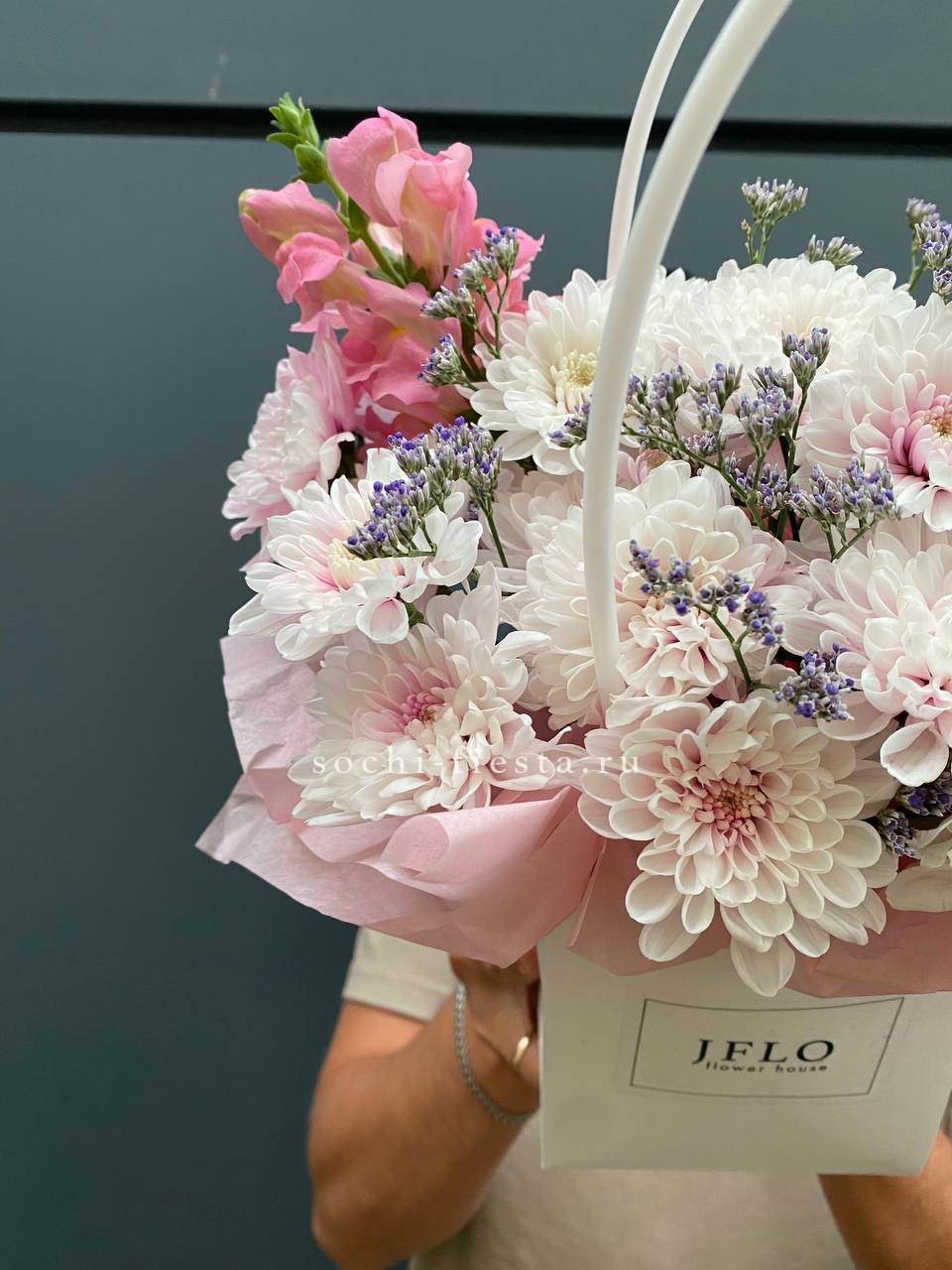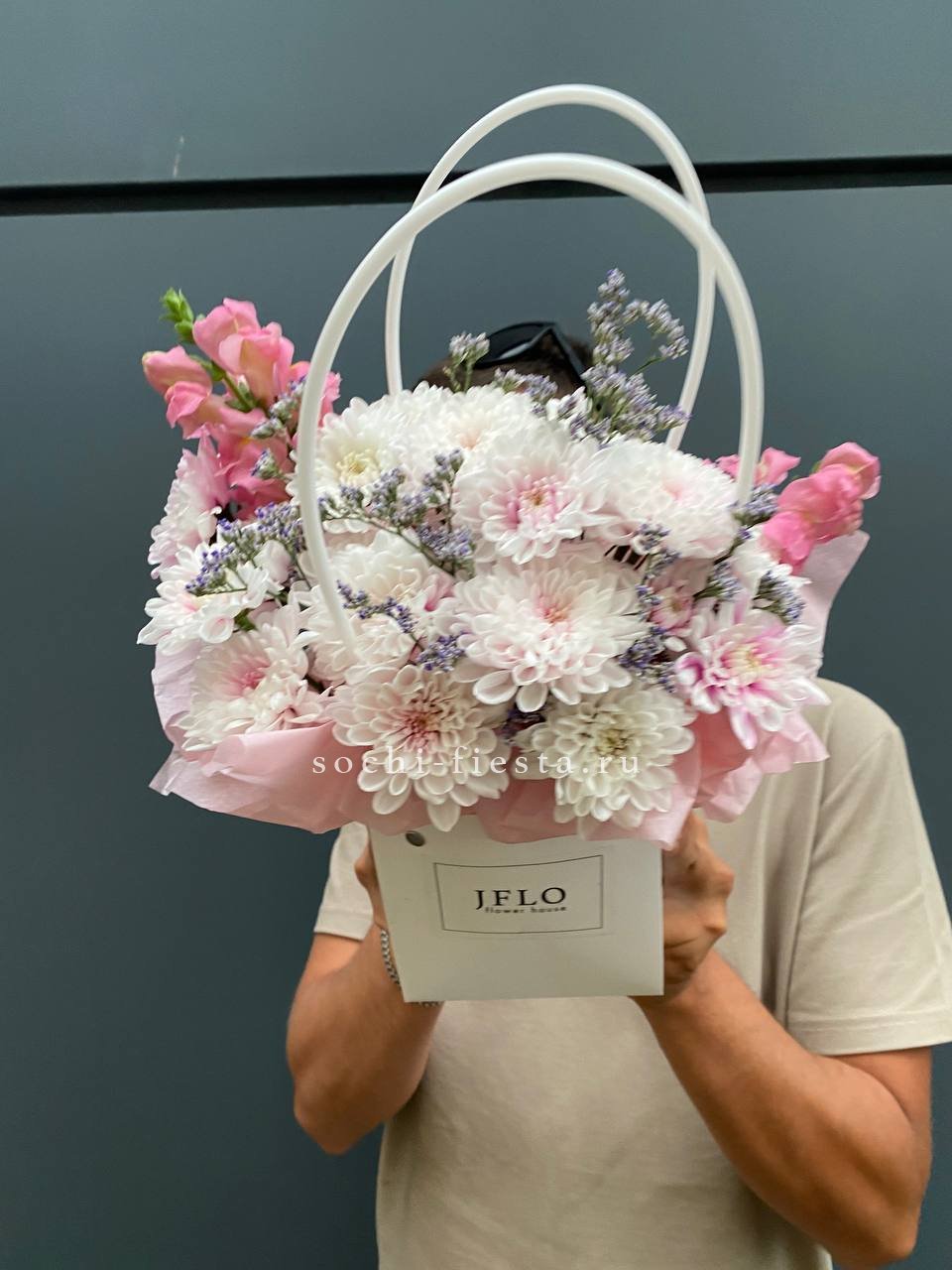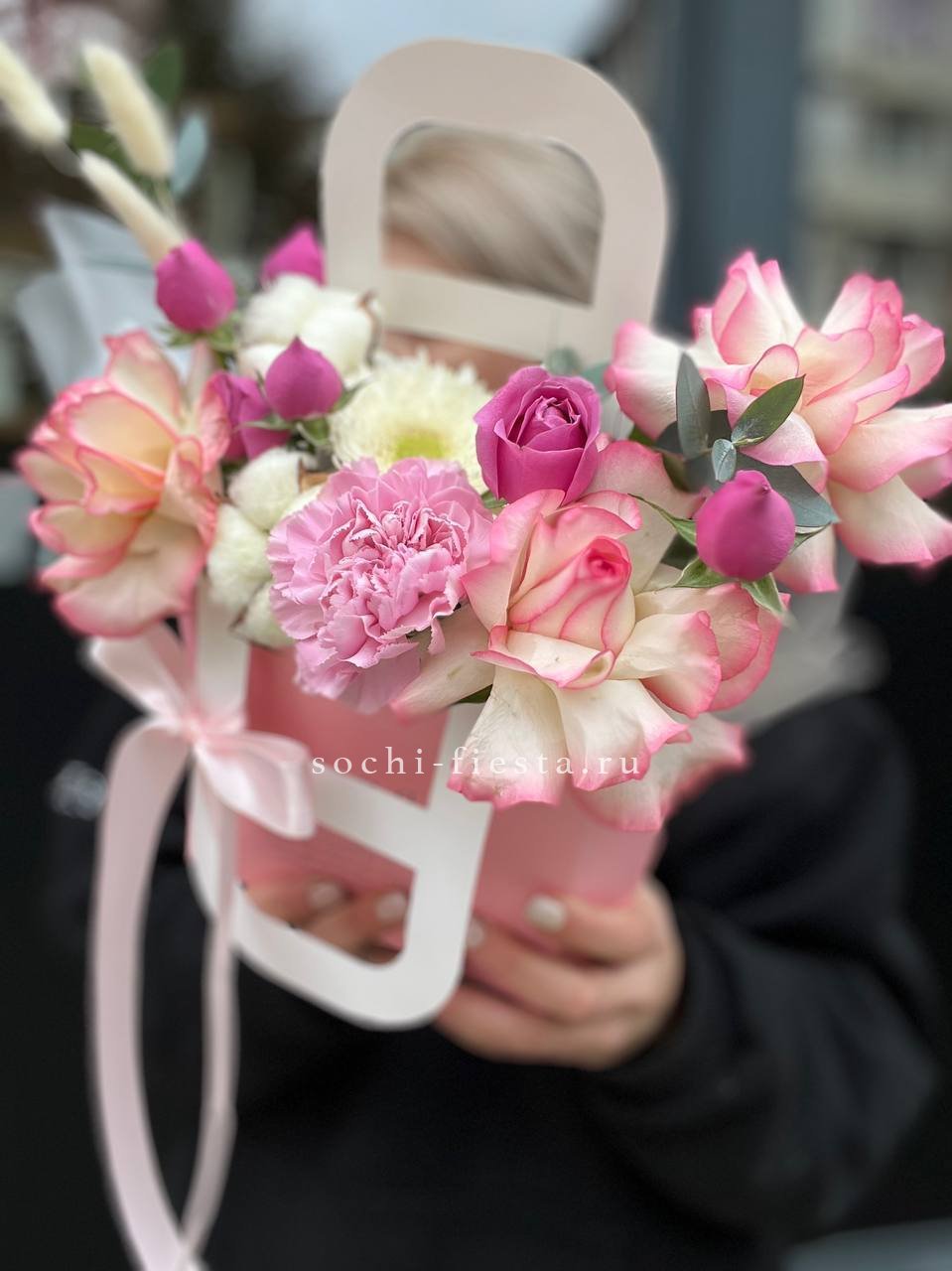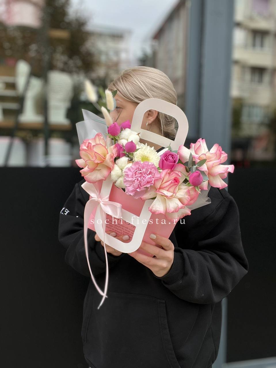 Розовые розы и диантусы переплетаются с кустовыми хризантемами в плотной округлой композиции. Альстромерия добавляет графичные акценты между бутонами. Сумочка собирает все элементы в аккуратную форму с естественным объёмом.