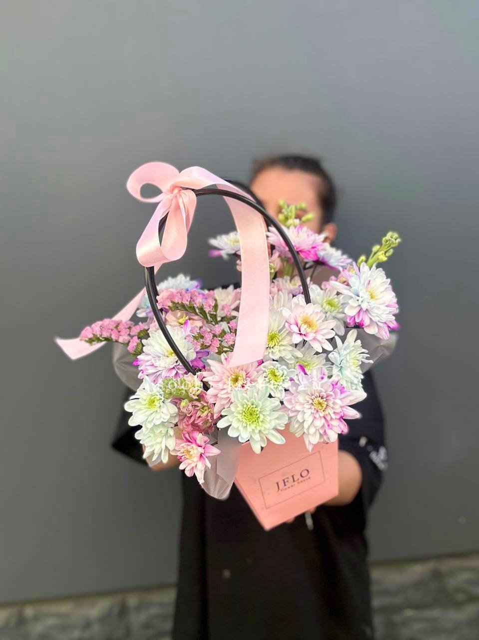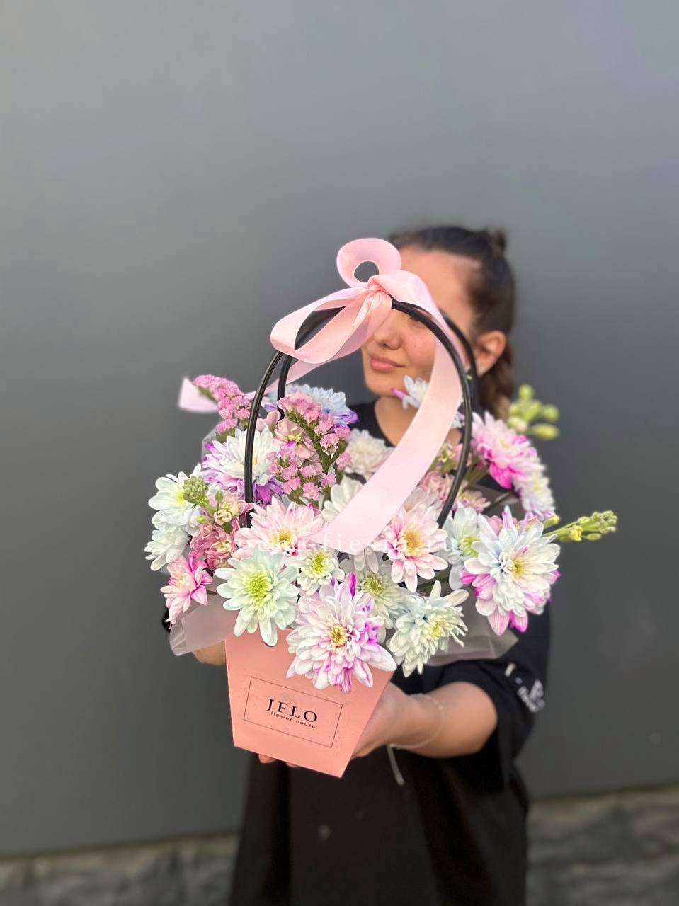 джумилия, гербера, мисти баблс, диантус, хлопок, лагурус, сумочка.