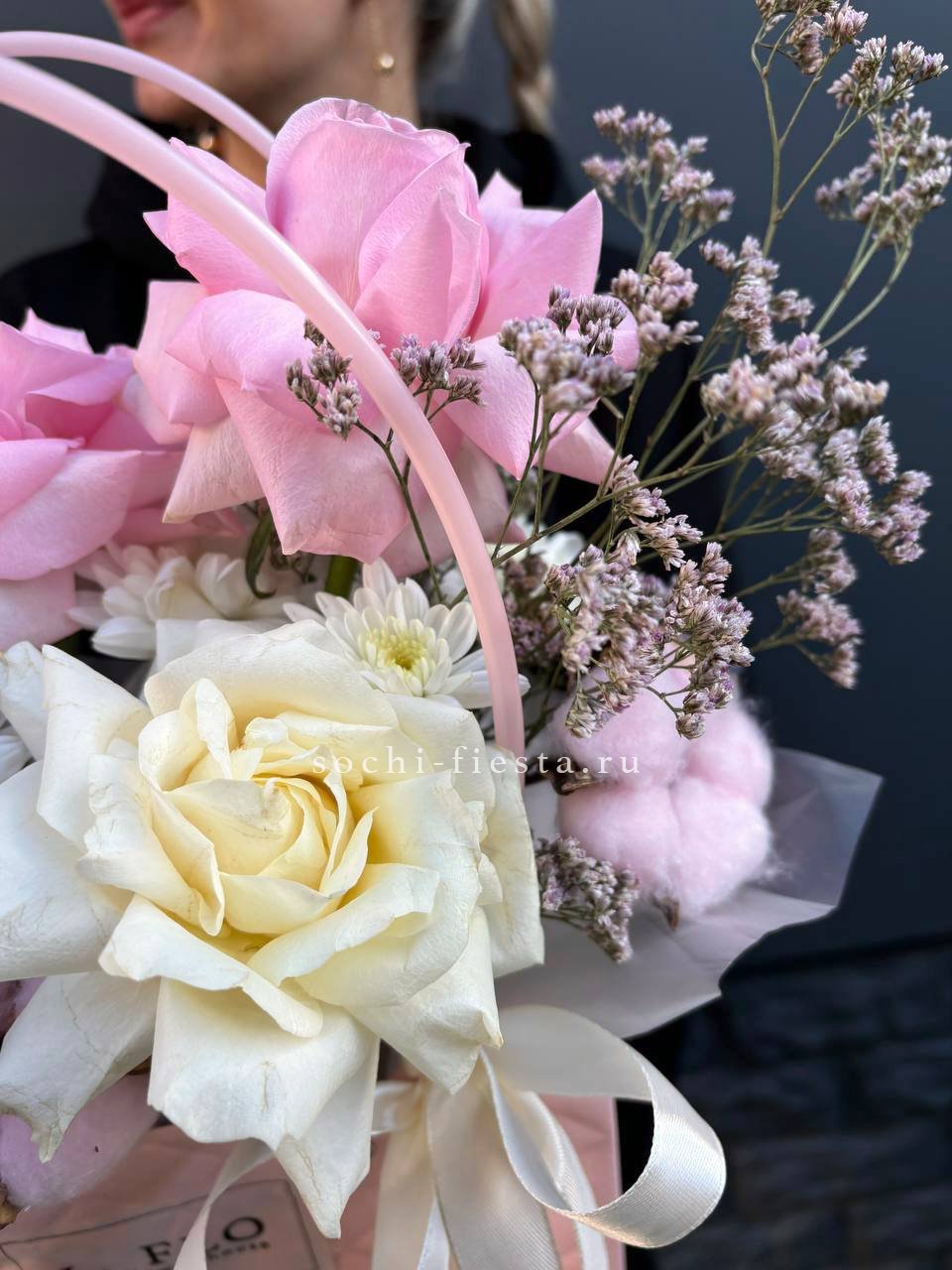 Яркая композиция в удобной сумочке объединяет розы Джумилия с герберами и воздушными соцветиями. Хлопок и лагурус добавляют природной легкости, а диантус создает цветовую динамику.