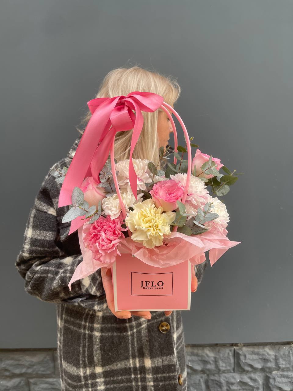 розы, эвкалипт, лента, сумка-кашпо.