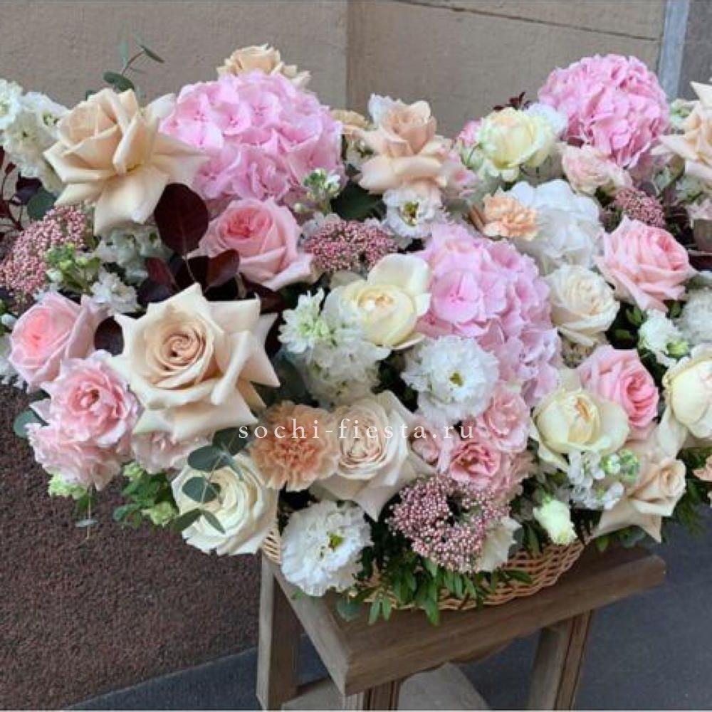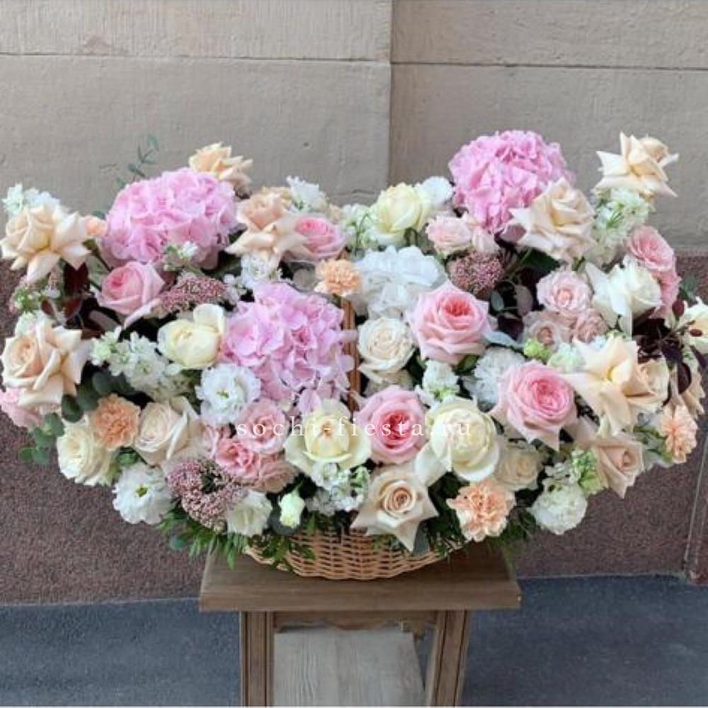 Корзина вмещает двести один бутон, образующих пышное цветочное полотно. Классическая форма подачи позволяет разместить композицию в любом пространстве без необходимости искать вазу. Впечатляющий объем для важных событий.