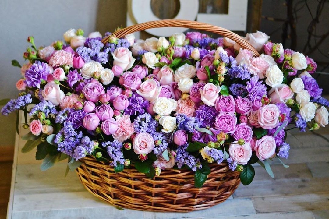Корзина объединяет гортензии, эустомы, розы и маттиолу в многослойную композицию. Разные фактуры лепестков создают визуальную глубину и насыщенность.