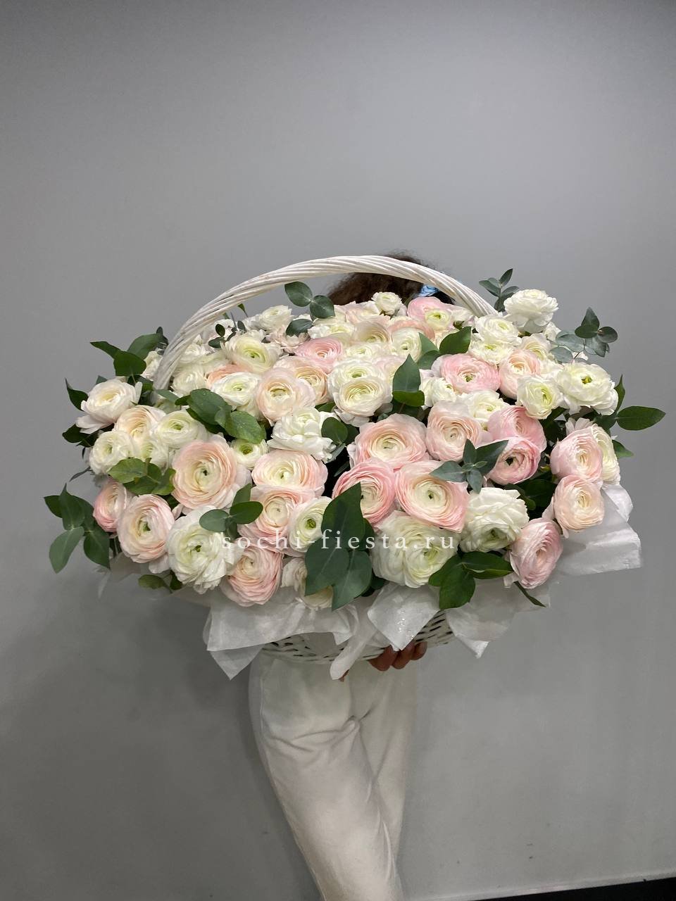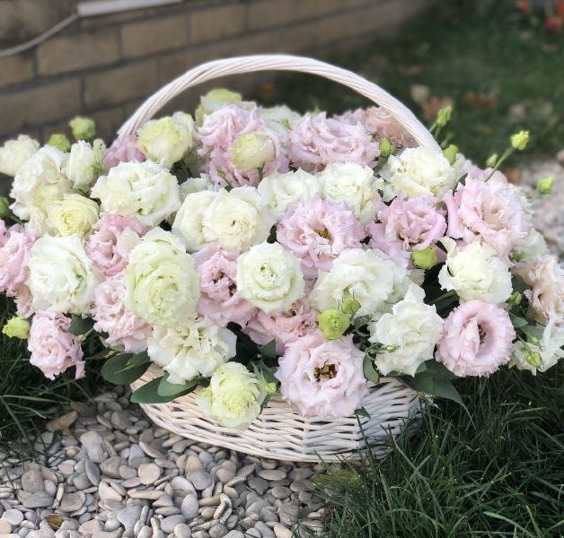 роза одноголовая, роза пионовидная, альстромерия, эустома, гортензия, ковыль, диантус, плетеная корзина.